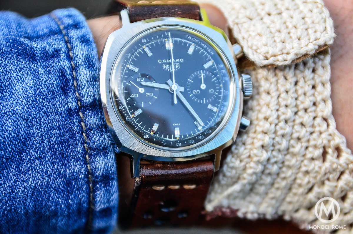 We at Monochrome-Watches love the vintage Heuers, especially the Autavia. For this article, we chose another one, a Camaro, one of the most stylish but strangely underrated racing chronographs of the brand. Launched in 1968, the Camaro, named after the famous Chevrolet, shares lots of similarities with the Carrera, in a slightly larger and cushion-shaped case. The dials and hands were very close to the Carrera, and so were the movements.