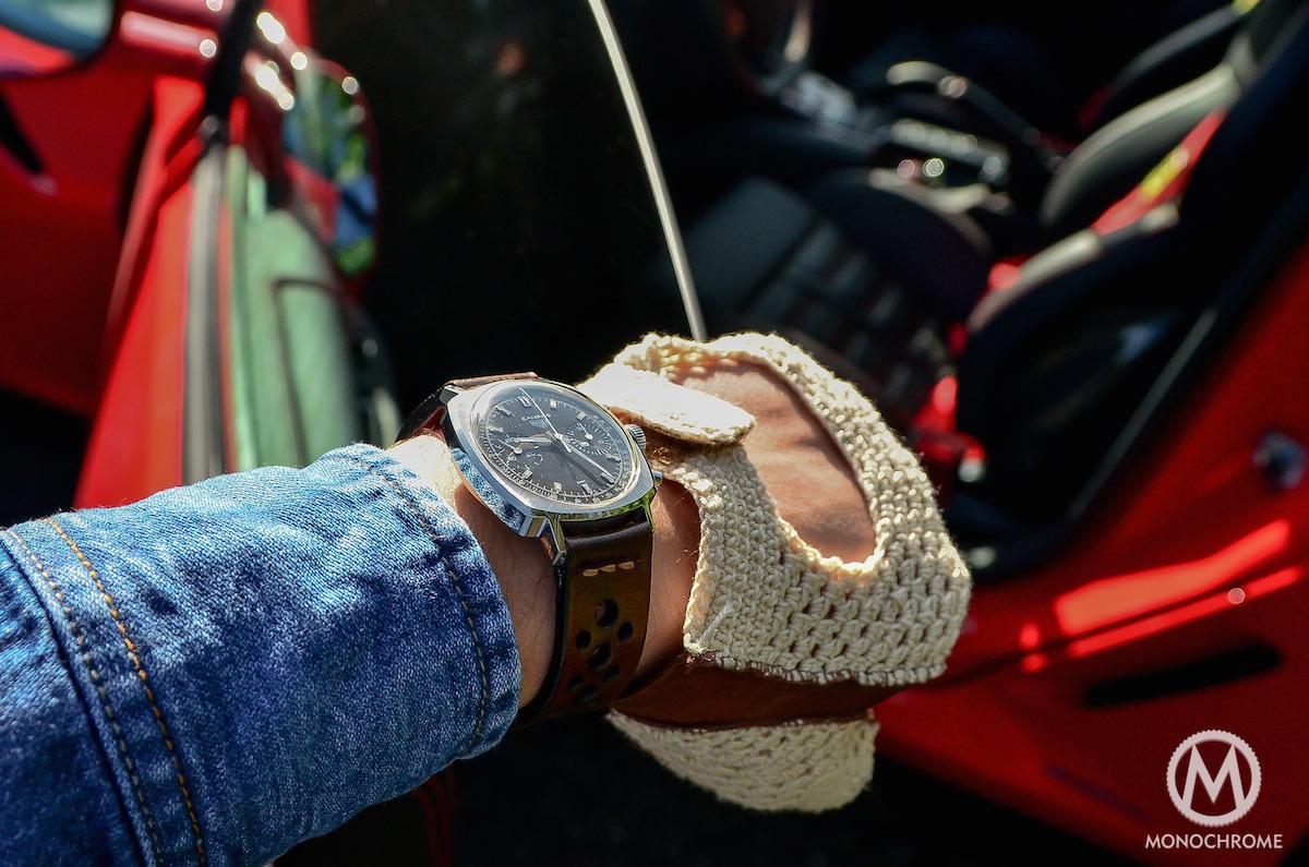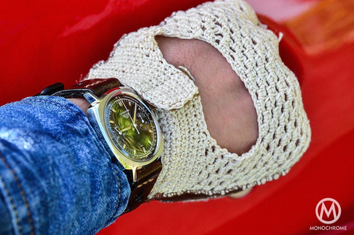 Driving gloves donned, harnesses locked, key in the starter… You’re ready to push the ‘Start Engine’ button and to wake up the V12 engine with a stunning scream. The Heuer Camaro couldn’t be in a better place. That’s where it has to be used, where its functional tachymeter scale and great legibility can best be enjoyed. Its 37mm case may sound small compared to modern standards but the look on the wrist, the vintage feeling and the association between the rally strap, the driving gloves and the slightly tropical dial is perfect.
