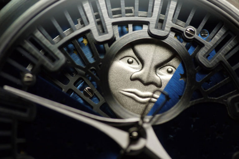 The case also has a complex shape. The satin brushed bezel shows small notches at 12 o’clock, 2, 4, 6, 8, and 10 o’clock. The rough and quite brutal design can also be seen with the lugs that are massive, cutting and highly salient. The overall watch is really influenced by design, but not only, as the movement is matching the exterior idea too.
