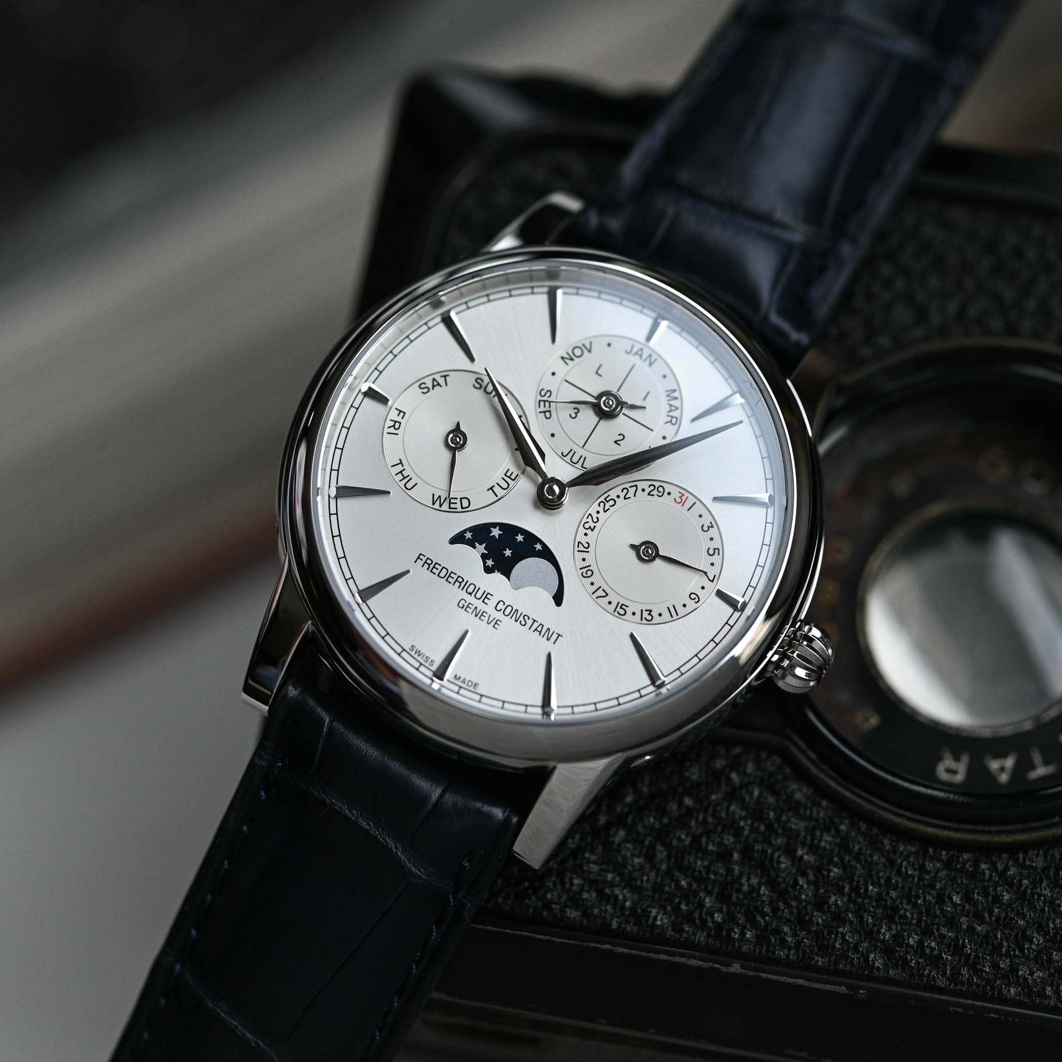 A perpetual calendar watch is the perfect demonstration of the history mentioned above. Let’s look at the Frederique Constant Classic Perpetual Calendar Manufacture, which is among the most affordable in-house mechanical perpetual calendar watches on the market. Looking at the dial, we see the hour hand based on 60 minutes and the minute hand based on 60 seconds, thanks to the Sumerians. The hour hand makes two revolutions per day with a 12-hour day and 12-hour night, generally thanks to the Ancient Egyptian sundials and duodecimal system. The calendar is based on the modern Gregorian type (thanks to Pope Gregory XIII in 1582) and automatically accounts for leap years, seen within the 12 o’clock sub-dial that also shows each of the 12 months. The 3 o’clock sub-dial shows the days of the month (up to 31) and properly adjusts between 30 and 31 days, and also for February’s 28 or 29 days. The 9 o’clock sub-dial shows the days of the week. A moon phase complication is seen at 6 o’clock, which not only accurately displays moon phases throughout the month but acts as a lunar calendar of sorts and can be used to track the 354 days of a lunar year.