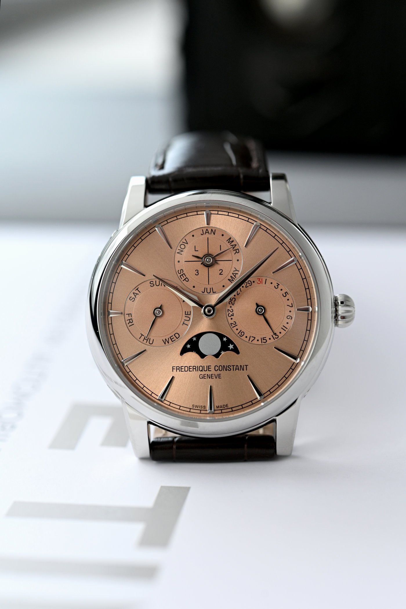 A perpetual calendar watch is the perfect demonstration of the history mentioned above. Let’s look at the Frederique Constant Classic Perpetual Calendar Manufacture, which is among the most affordable in-house mechanical perpetual calendar watches on the market. Looking at the dial, we see the hour hand based on 60 minutes and the minute hand based on 60 seconds, thanks to the Sumerians. The hour hand makes two revolutions per day with a 12-hour day and 12-hour night, generally thanks to the Ancient Egyptian sundials and duodecimal system. The calendar is based on the modern Gregorian type (thanks to Pope Gregory XIII in 1582) and automatically accounts for leap years, seen within the 12 o’clock sub-dial that also shows each of the 12 months. The 3 o’clock sub-dial shows the days of the month (up to 31) and properly adjusts between 30 and 31 days, and also for February’s 28 or 29 days. The 9 o’clock sub-dial shows the days of the week. A moon phase complication is seen at 6 o’clock, which not only accurately displays moon phases throughout the month but acts as a lunar calendar of sorts and can be used to track the 354 days of a lunar year.