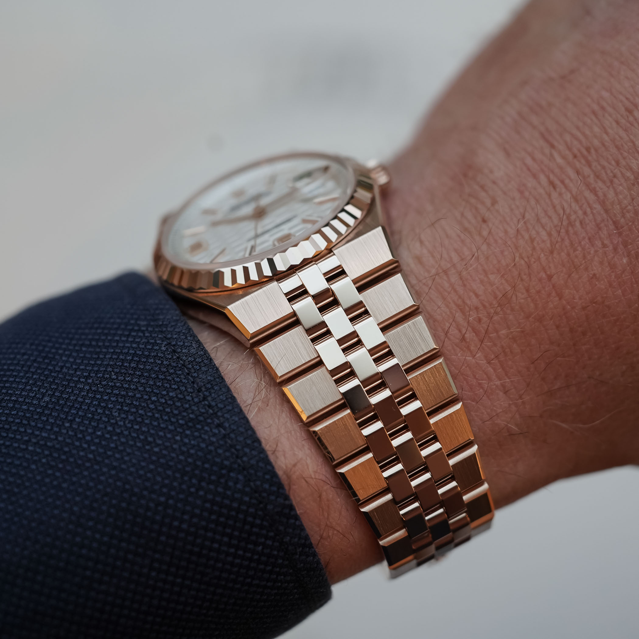 But first, let me tell you why I wouldn’t choose the 40mm version. Again, this is all personal; however, one of the gripes I expressed in my review of the entire collection here was the fact that this watch has a lot of textures. It combines a complex bracelet with multiple links, a fluted bezel with less flutes than normally found on a DD or DJ (60 vs. 72 flutes, making them larger) and a dial with a lot going on: a honeycomb pattern, fine guilloche-like texture between the combs, a graduated inner bezel, large applied numerals and elongated markers, texts printed with cartouches… If you combine all of these elements within a fairly large watch of 40mm, it gives quite a striking result.