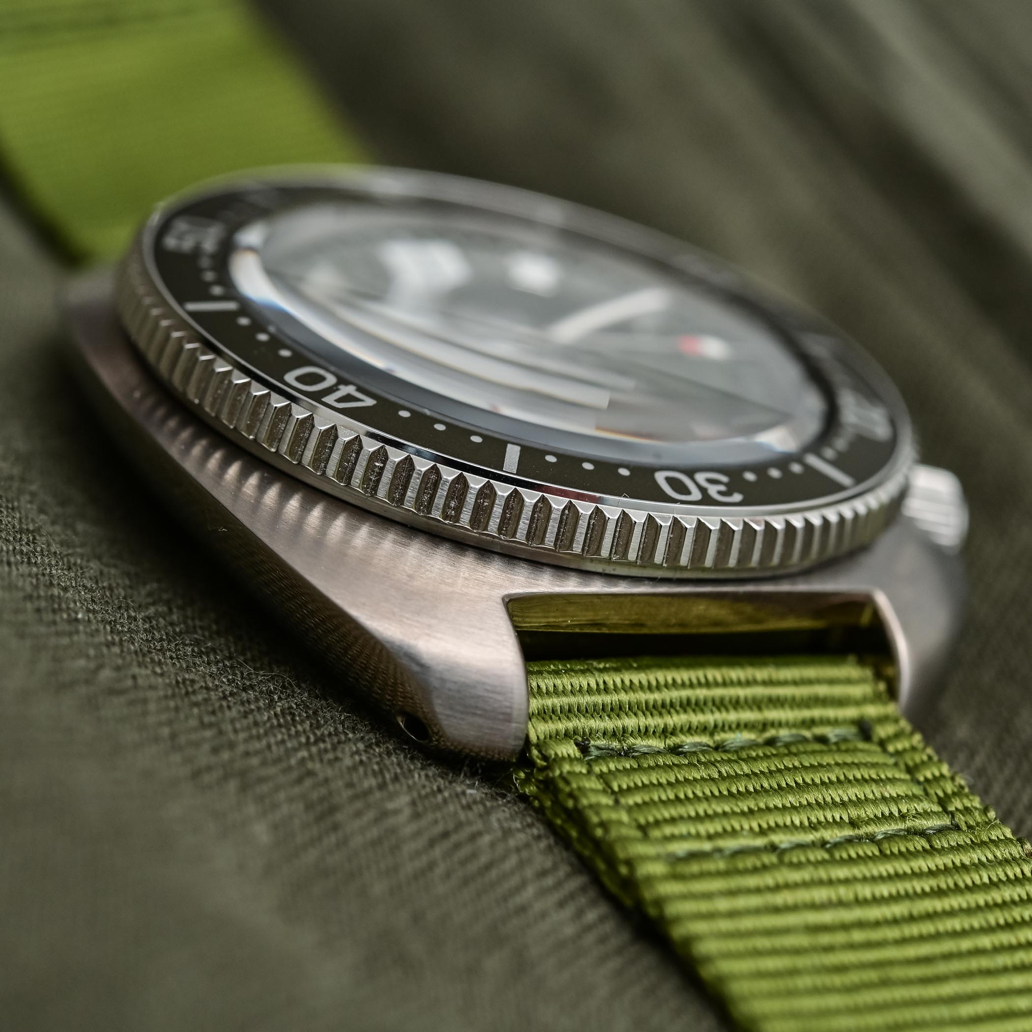 While the black version would have been a reasonable, historically relevant choice, I decided to go for the green model. First of all, I think the colour is ultra-cool. It’s different, lively, warm and adds this military touch that, without making real sense in the 6105 context, is simply fun and desirable. A good point too was the use of anodized aluminium for the bezel, a material that I prefer in terms of look and feel for vintage-inspired watches. Ceramic certainly is a great option, but I tend to prefer matte surfaces to glossy ceramic.