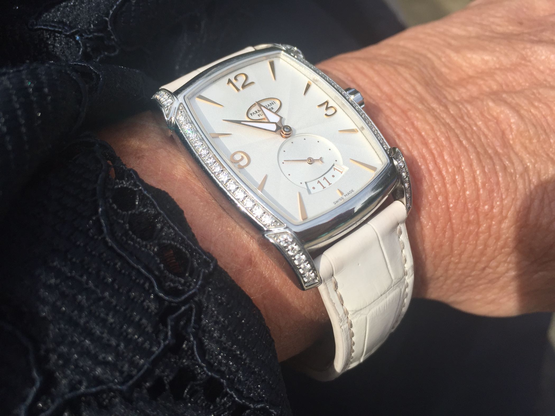 The Kalparisma Agenda watch features a gently curved tonneau-shaped watch with softly rounded edges and elongated lugs for a more sensual and ergonomic appeal. The one I wore was crafted in stainless steel and was partially bedecked with 46 Top Wesselton diamonds. In fact, the diamond design was nice. Instead of the entire case being adorned with diamonds, just the lugs and the vertical edges of the case are gem set. It is a statement of sophisticated elegance rather than full-on bling.
