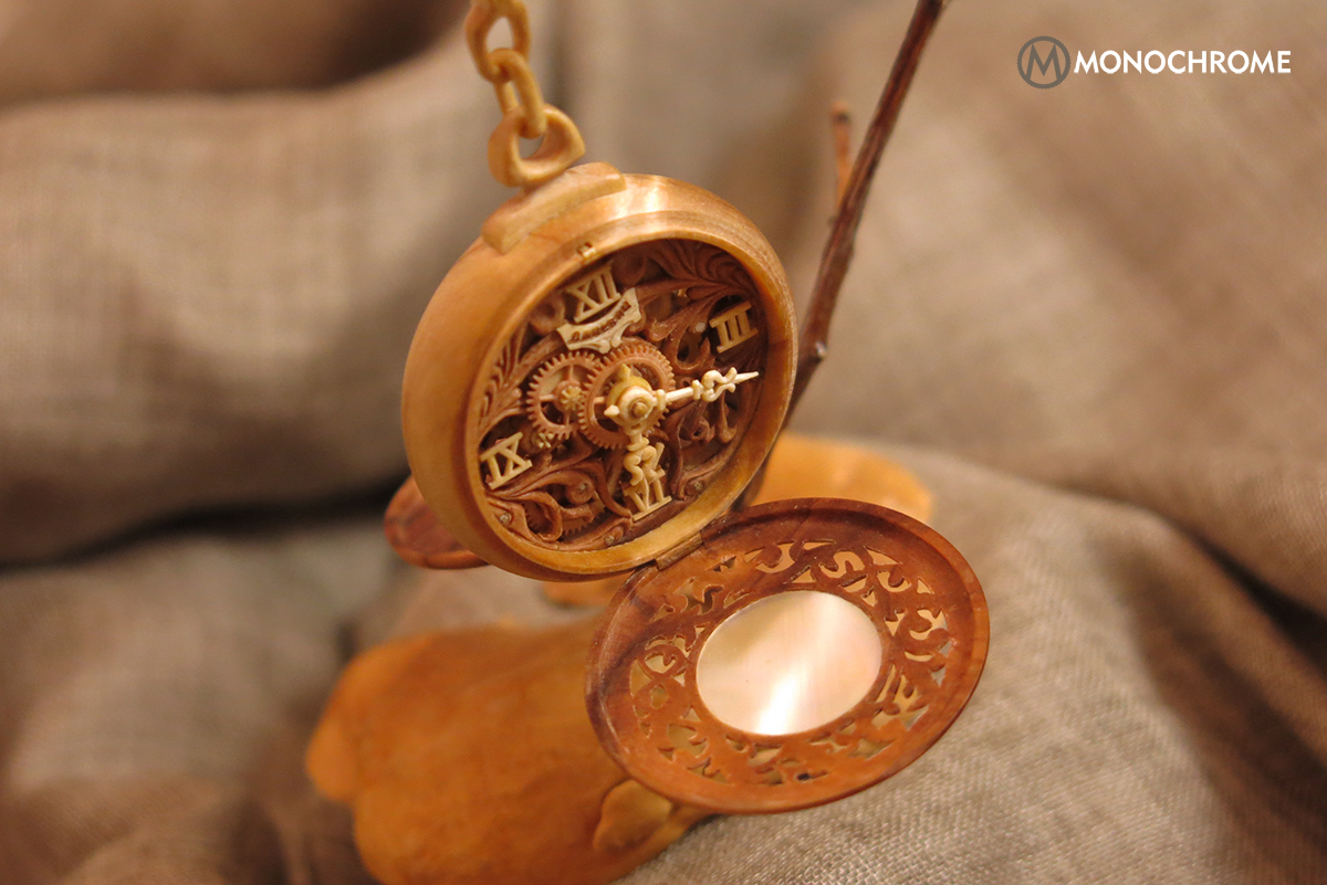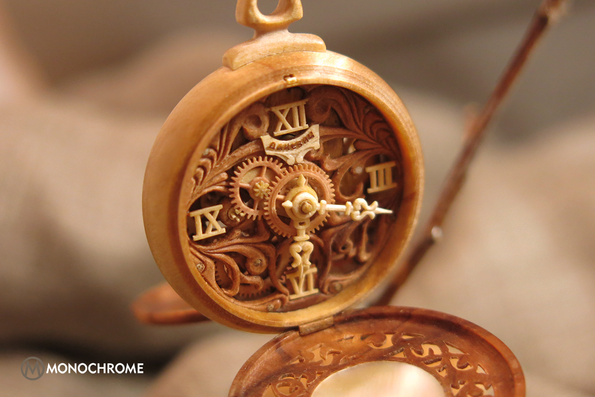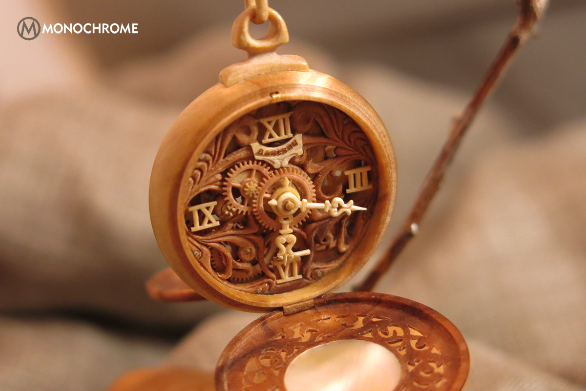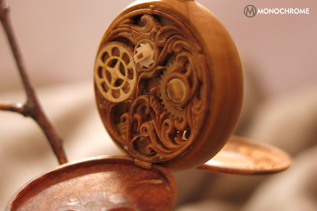 Just take a look at this little necklace-watch, whose movement and case only weigh 4 grams altogether. The innate delicacy becomes very apparent upon handling the watch. It feels almost too light for you to believe it actually works, but it does! All parts are meticulously crafted from multiple types of wood, carefully hand-selected by Valerii for their respective intended purposes in the timepiece. One of the other reasons it’s so incredibly light is its size of only 30mm.