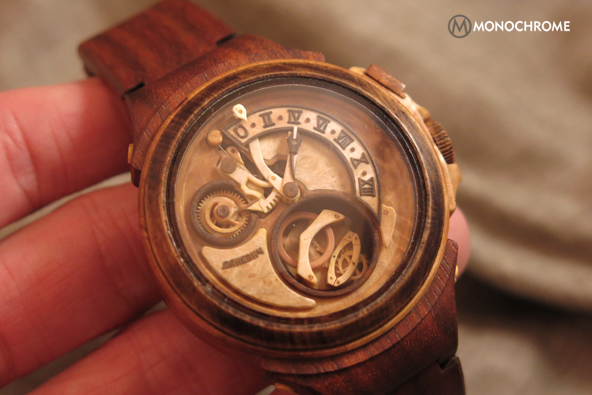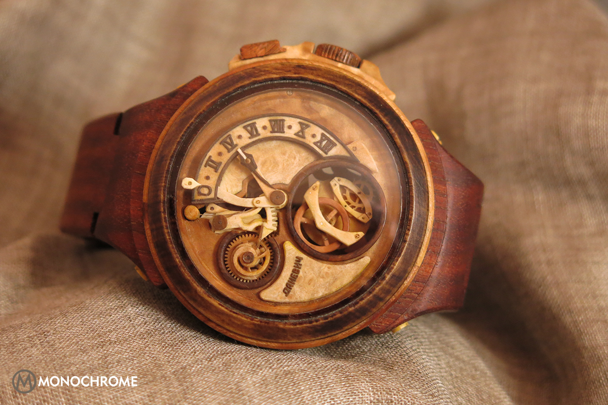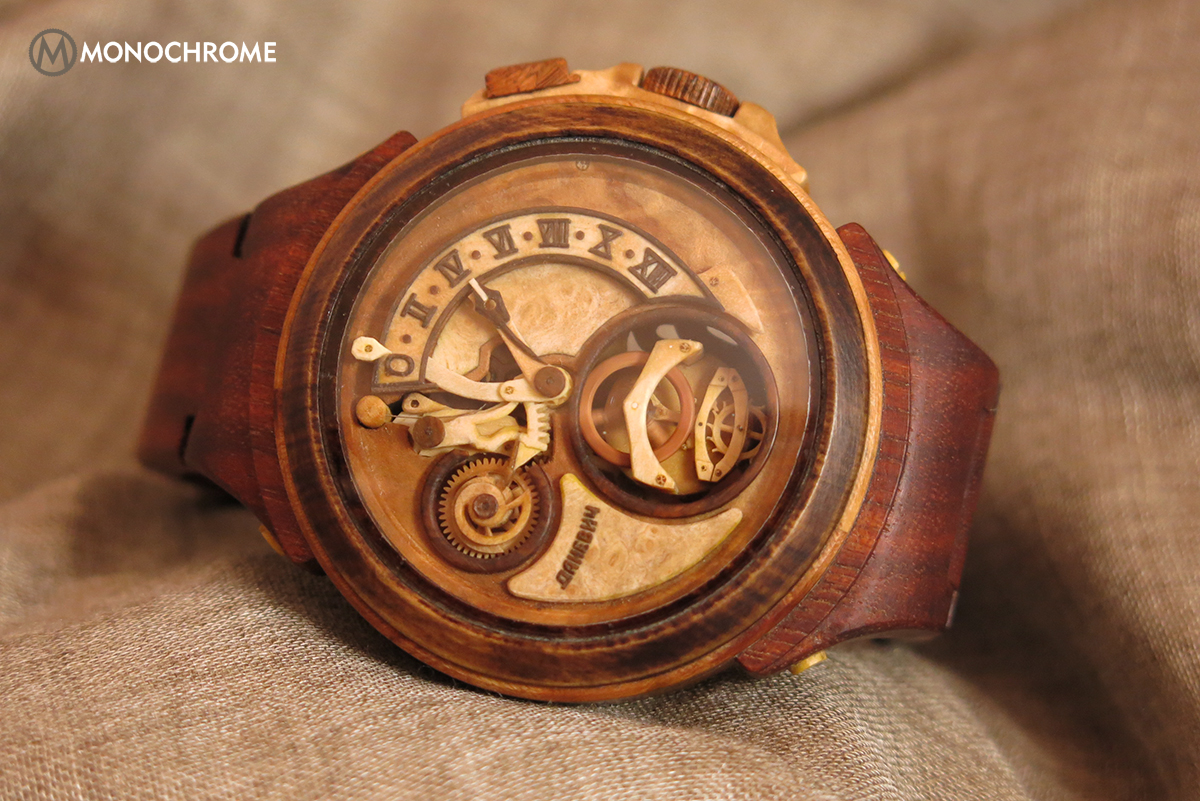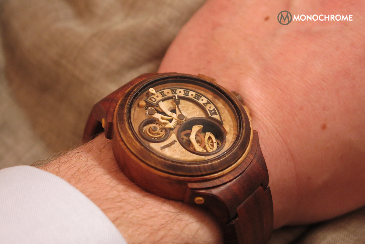 The case of the Retrograde is 46mm wide and 18mm thick. Using wood only (except for the 4 small springs) results in a very lightweight watch, the likes of which other independents or manufacturers need extremely high-tech materials to achieve. The result is a watch that catches the eye, due to the various colors of wood, the size and the complicated movement inside. It will unlikely be a daily beater, but it is still a very wearable watch. The large, wooden links are attached to the case with wooden screws, and a wooden buckle.