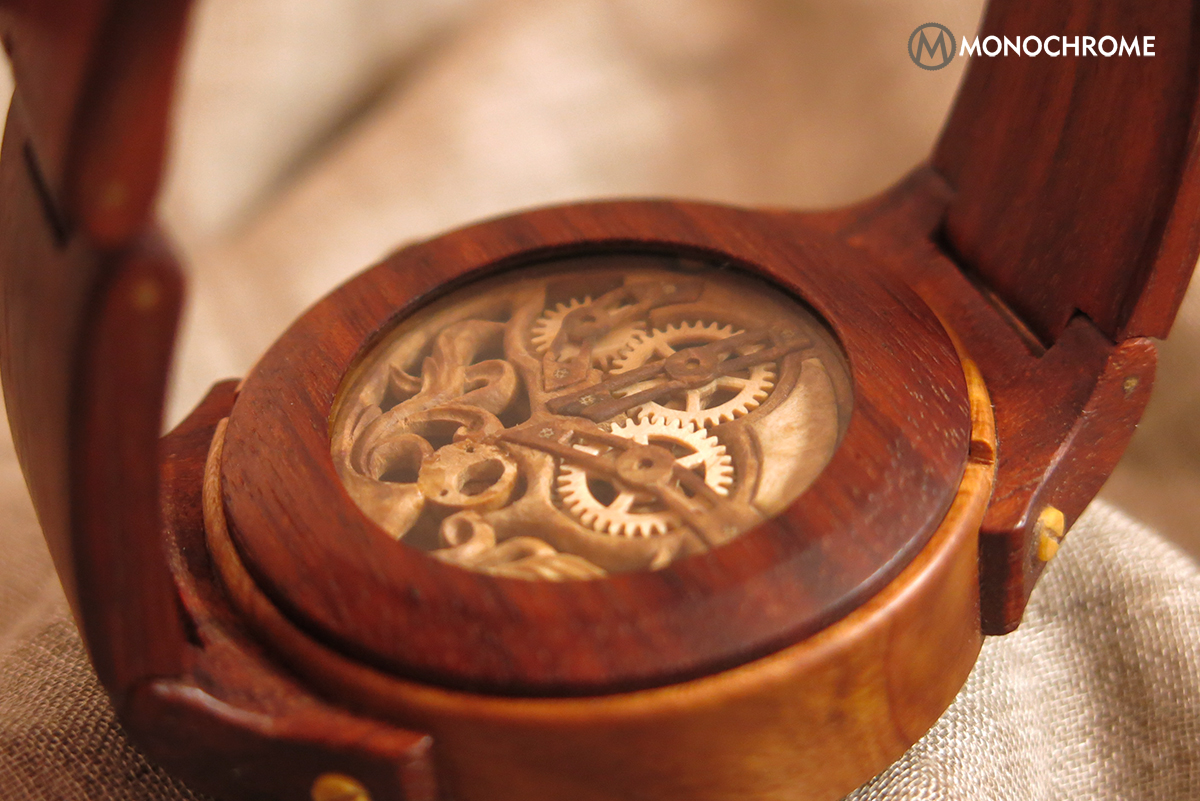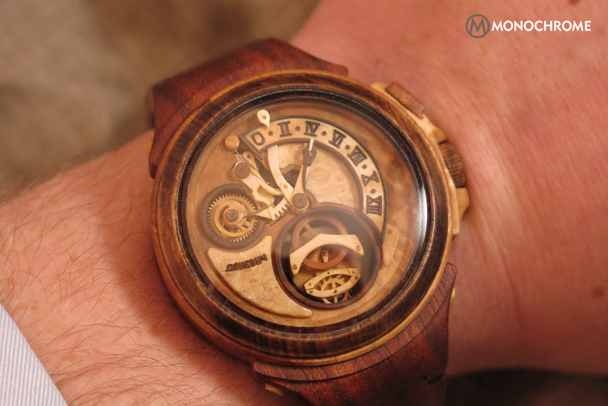 Using wood from trees such as Australian Guaiacum, Bubinga, Birch, Bamboo, Canker, Walnut and many others, Valerii manages to create complicated timepieces, including some very small pocket watches and a wristwatch with a flying tourbillon and retrograde time indication. The selection of the type of wood is a tricky thing, as each one has different properties.