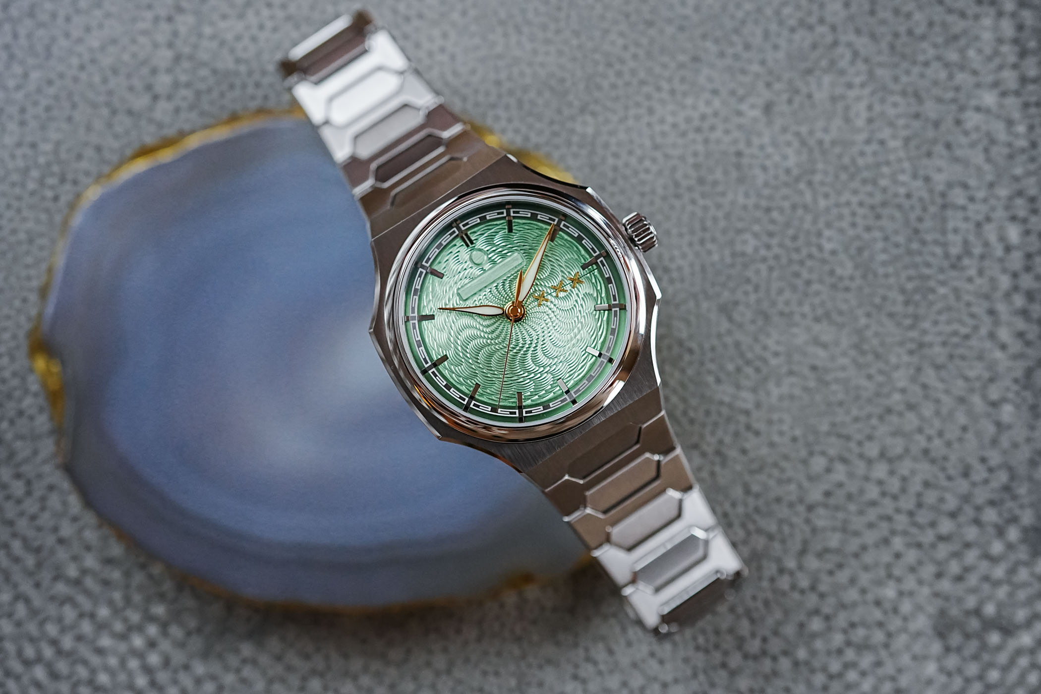 Based on the success of the brand’s luxury sports watch with integrated design, the Perception, Austen Chu created a special edition for Wristcheck, with a Jade-green dial, a specific guilloché pattern and a titanium case/bracelet. A 100-piece limited edition that sold out almost instantly after launch. So what about the watch we’re looking at today? As always, when creating a high-end object, specifically when the hand of a craftsman is involved, not everything goes as planned. When crafting the handsome jade green guilloche? dial for this special edition, Master Cheng, China’s sole master guilloche? craftsman, used a hand-operated rose engine. Following that, each dial underwent rigorous quality control and scrutiny by Master Cheng and Robin Tallendier to find the slightest irregularity in its guilloche? pattern. As you can imagine, some dials were rejected by Tallendier (not an easy decision to make knowing the time and cost of these dials).