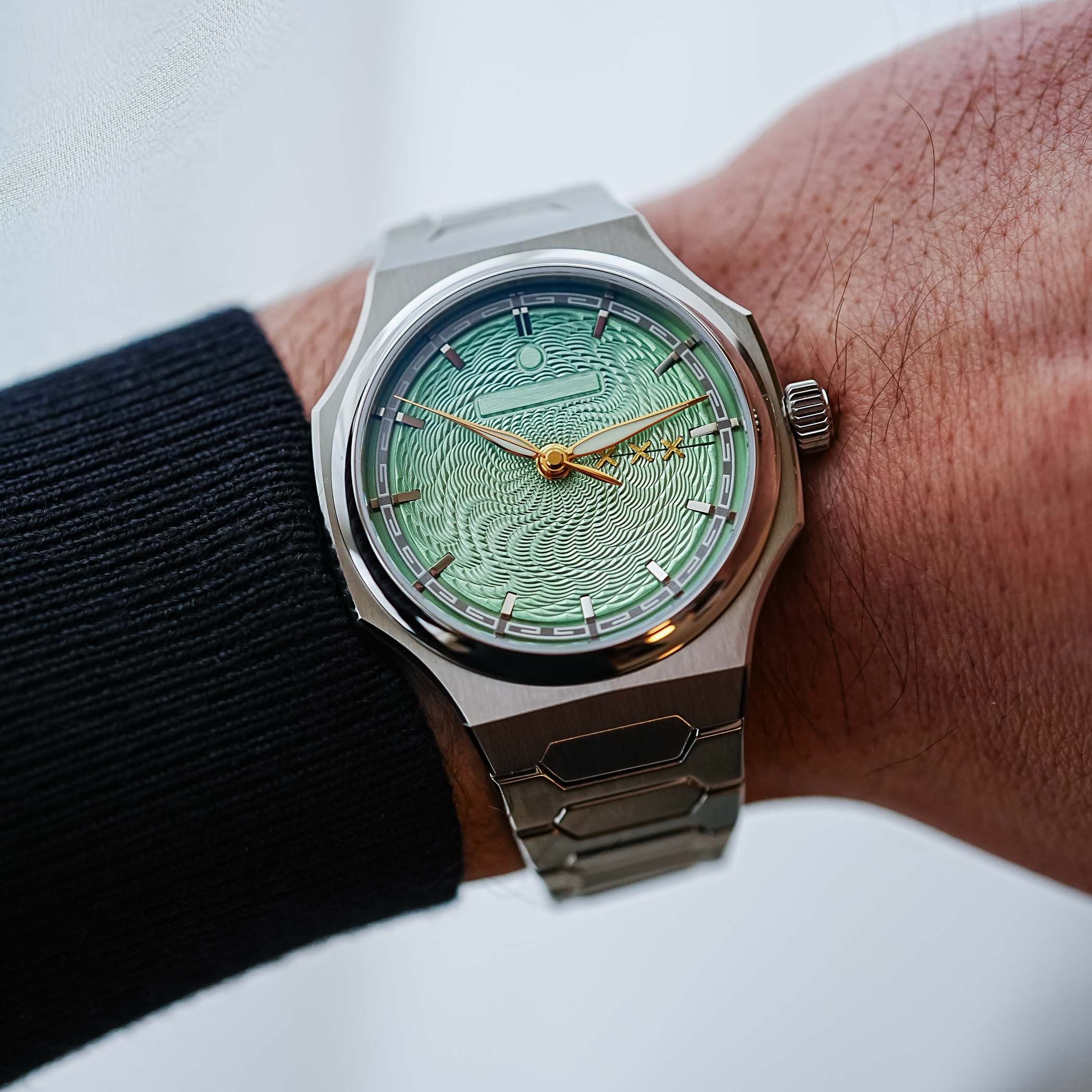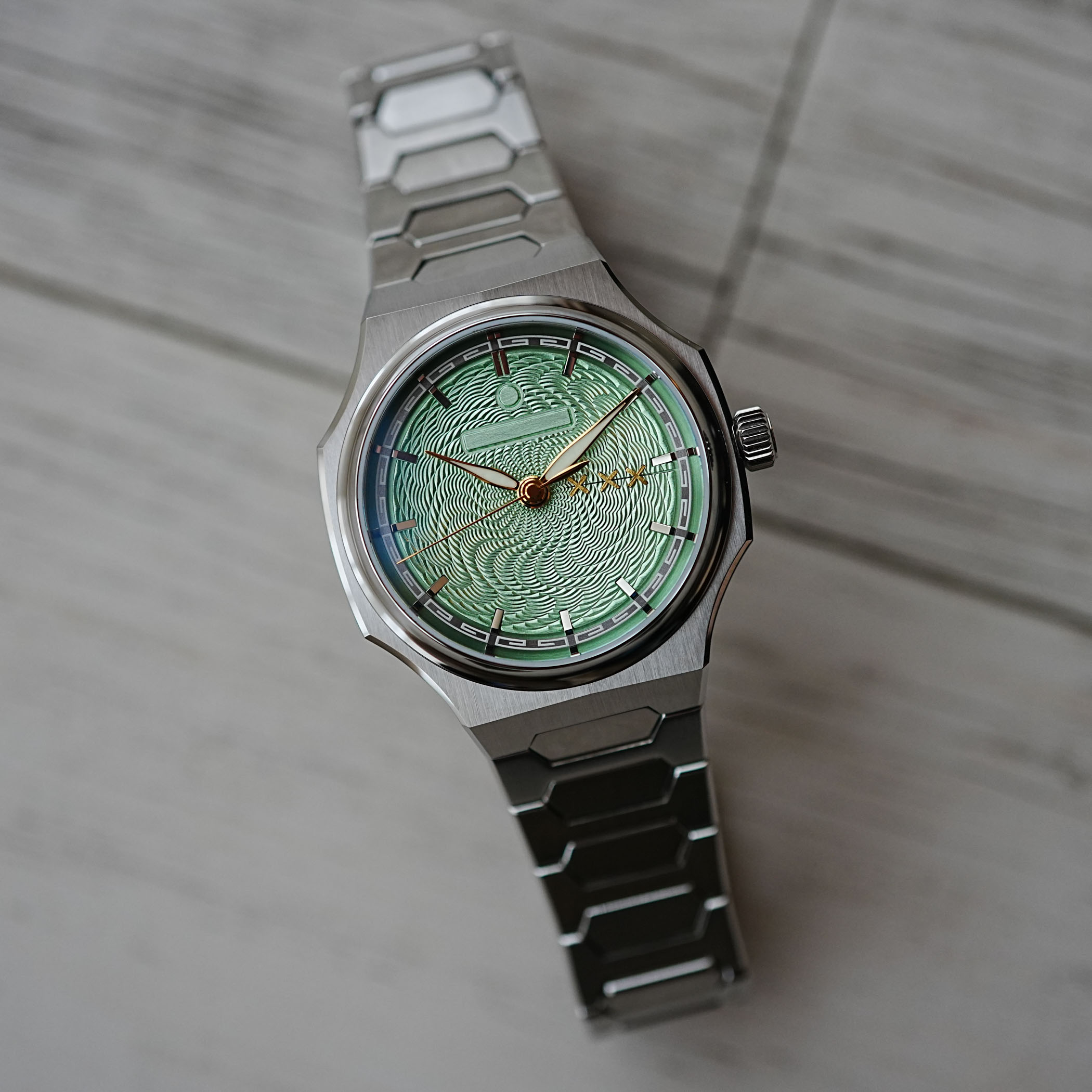 Based on the success of the brand’s luxury sports watch with integrated design, the Perception, Austen Chu created a special edition for Wristcheck, with a Jade-green dial, a specific guilloché pattern and a titanium case/bracelet. A 100-piece limited edition that sold out almost instantly after launch. So what about the watch we’re looking at today? As always, when creating a high-end object, specifically when the hand of a craftsman is involved, not everything goes as planned. When crafting the handsome jade green guilloche? dial for this special edition, Master Cheng, China’s sole master guilloche? craftsman, used a hand-operated rose engine. Following that, each dial underwent rigorous quality control and scrutiny by Master Cheng and Robin Tallendier to find the slightest irregularity in its guilloche? pattern. As you can imagine, some dials were rejected by Tallendier (not an easy decision to make knowing the time and cost of these dials).