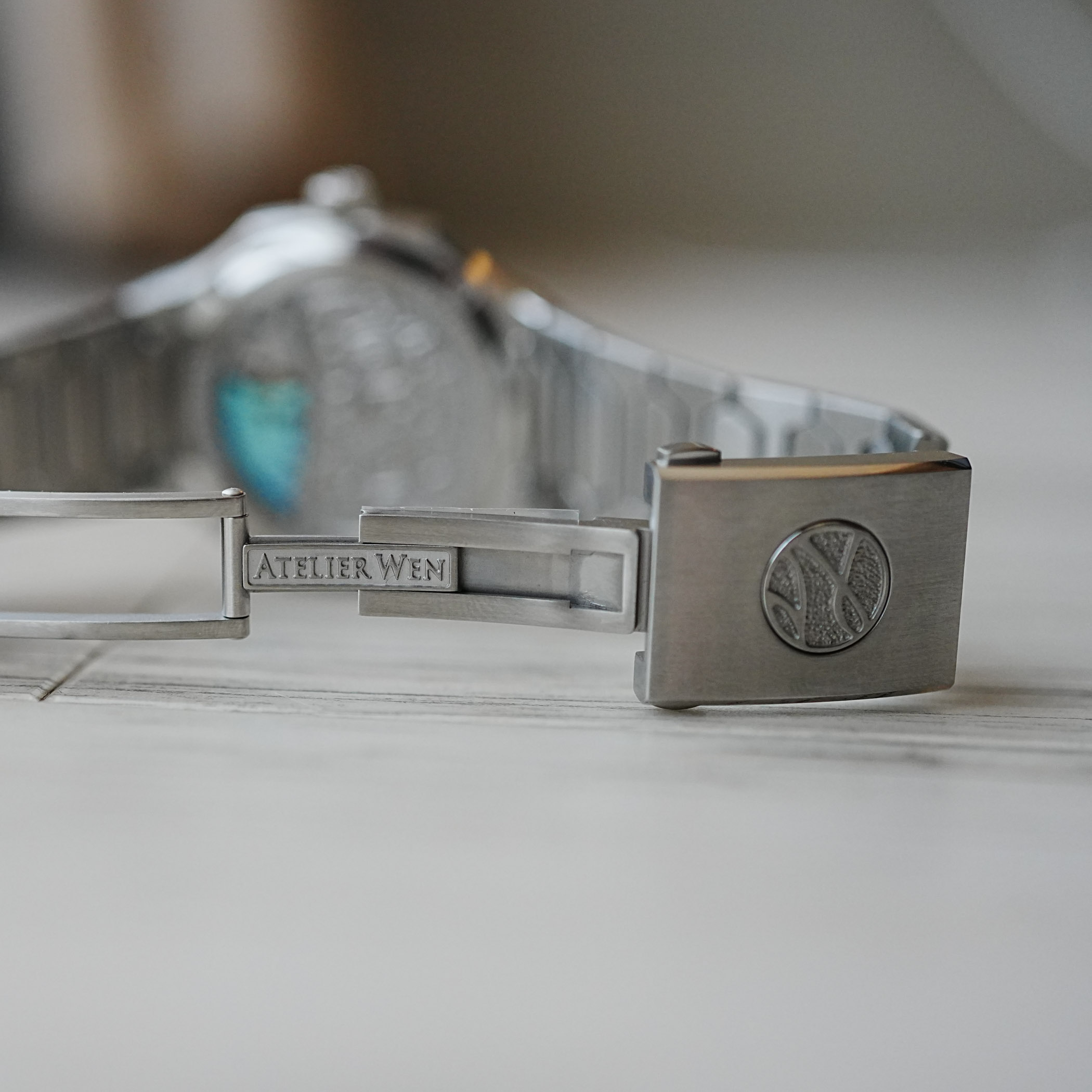 The back retains the deeply embossed pattern – a shishi motif – with a partial sapphire crystal revealing some of the movement. The rotor is plated in green. The movement itself is a customised extra-thin Dandong SL1588. Beating at 4Hz, this movement boasts a 41h power reserve and is adjusted in 5 positions to heat and cold. The finishing includes Geneva stripes, perlage and polished bevels. It is worn on a 904L steel integrated bracelet, with great attention to detail. It combines vertically brushed surfaces and polished bevels on the edges, and the clasp features an “on-the-fly” micro-adjustment device. Equipped with an easy-interchangeability system, the watch is also delivered with a grey FKM rubber strap.