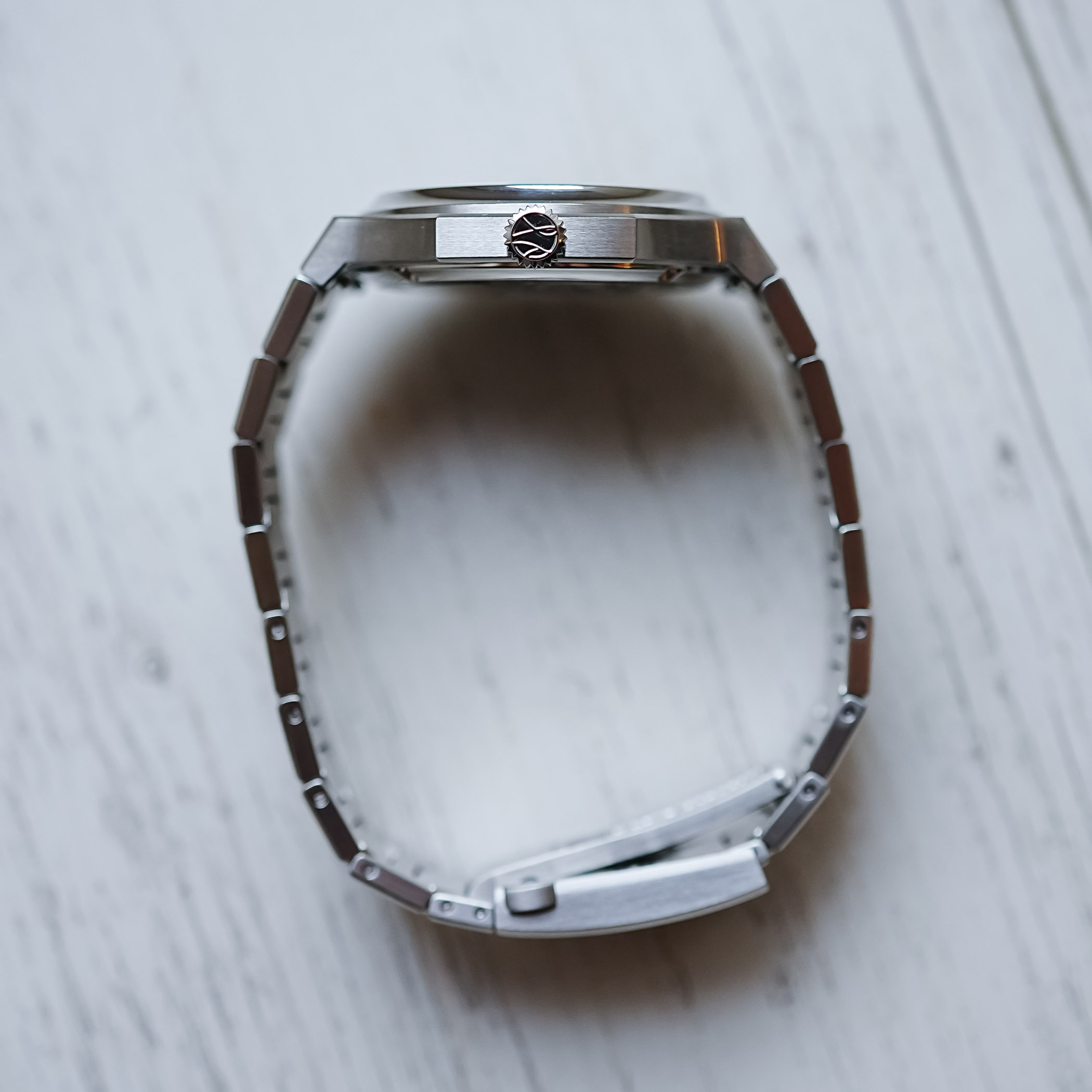 Beyond the healing of this mark of disgrace on the dial, these Wristcheck x Atelier Wen Perception are now housed in a 904L stainless steel case and not in titanium anymore. The rest, save for some specific engravings on the back, is identical to previous iterations of this watch. This surprisingly integrated sports watch measures a highly pleasant 40mm diameter, with a 47mm length and a fairly controlled thickness of 9.4mm. Under close inspection, the finishing, which combines vertically brushed surfaces and strong, contrasting polished accents, is rather impressive and detailed. Water-resistant to 100m, the Perception features a screw-down crown and a sapphire crystal.