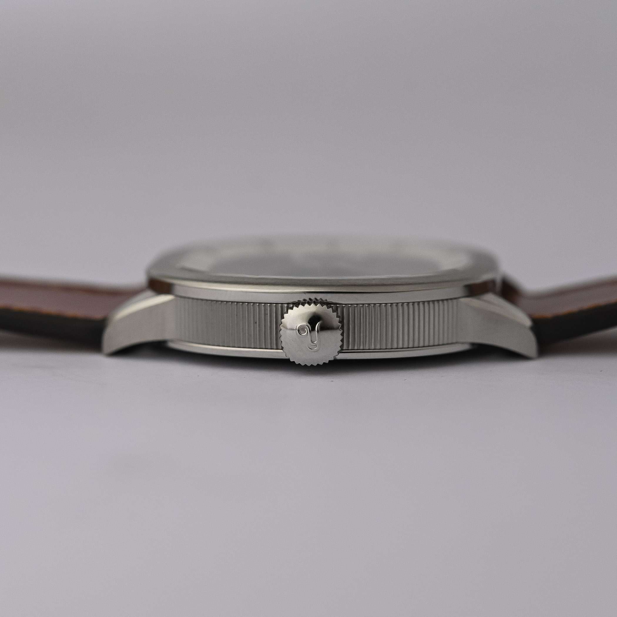 The new Yema Granvelle is distinguished by a rather compact, cushion-shaped case measuring 39mm with an 8.60mm thickness. Its proportions are clean and balanced, with a wrist presence that avoids bulk. Polished bevels and a polished coin-edge mid-case offset the vertical brushing on the 316L stainless steel case. The push-pull crown, also cushion-shaped and signed with Yema’s vintage logo, integrates well into the overall silhouette. A flat sapphire crystal with an anti-reflective coating tops the case. The watch offers 50m of water resistance, adequate for daily wear and in line with its purposeful design.