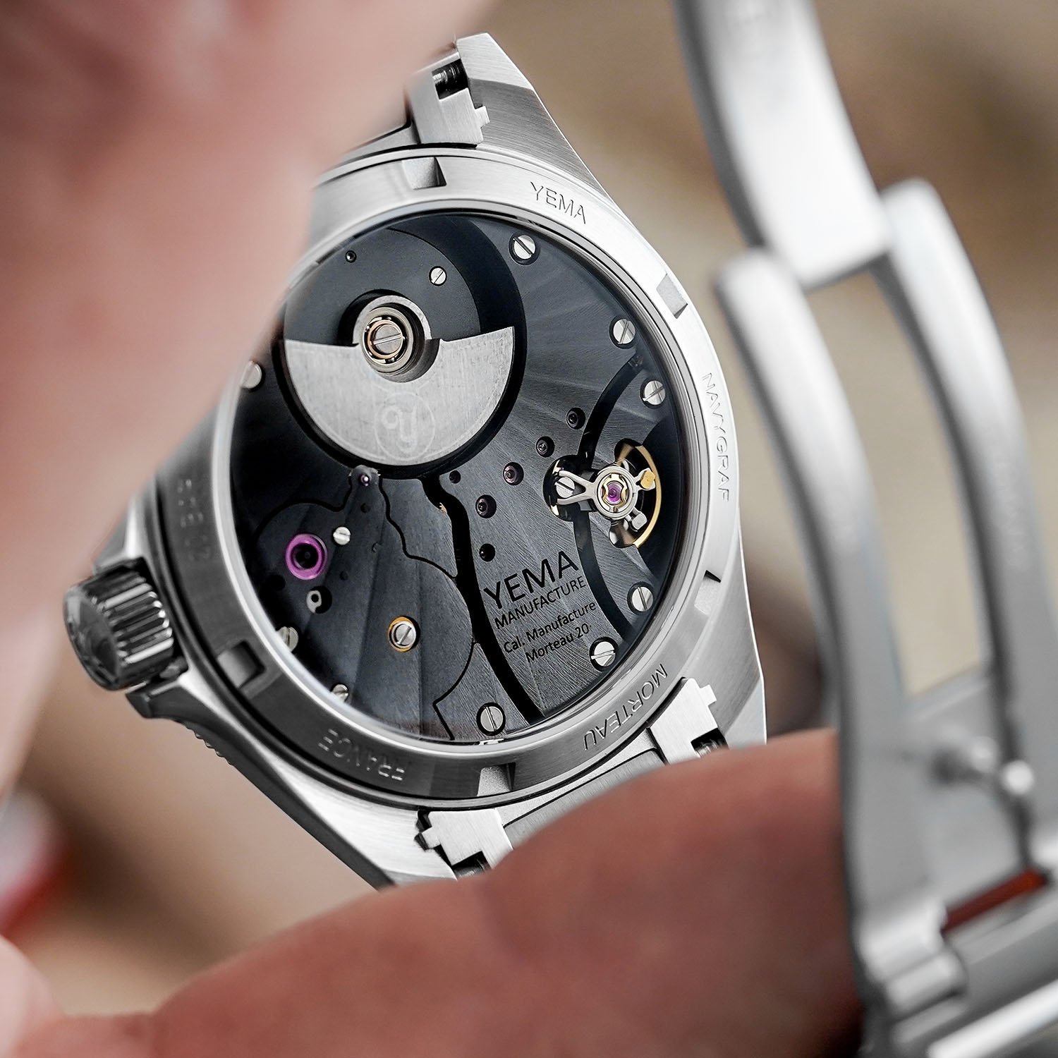 Equipped with Yema’s slim 3.7mm automatic movement, calibre CMM.20, the bidirectional tungsten micro-rotor is mounted on ball bearings and delivers energy to the mainspring for a robust 70-hour power reserve. The sapphire crystal caseback offers a view of the contemporary movement with dark-coated bridges decorated with radiating Côtes de Genève.