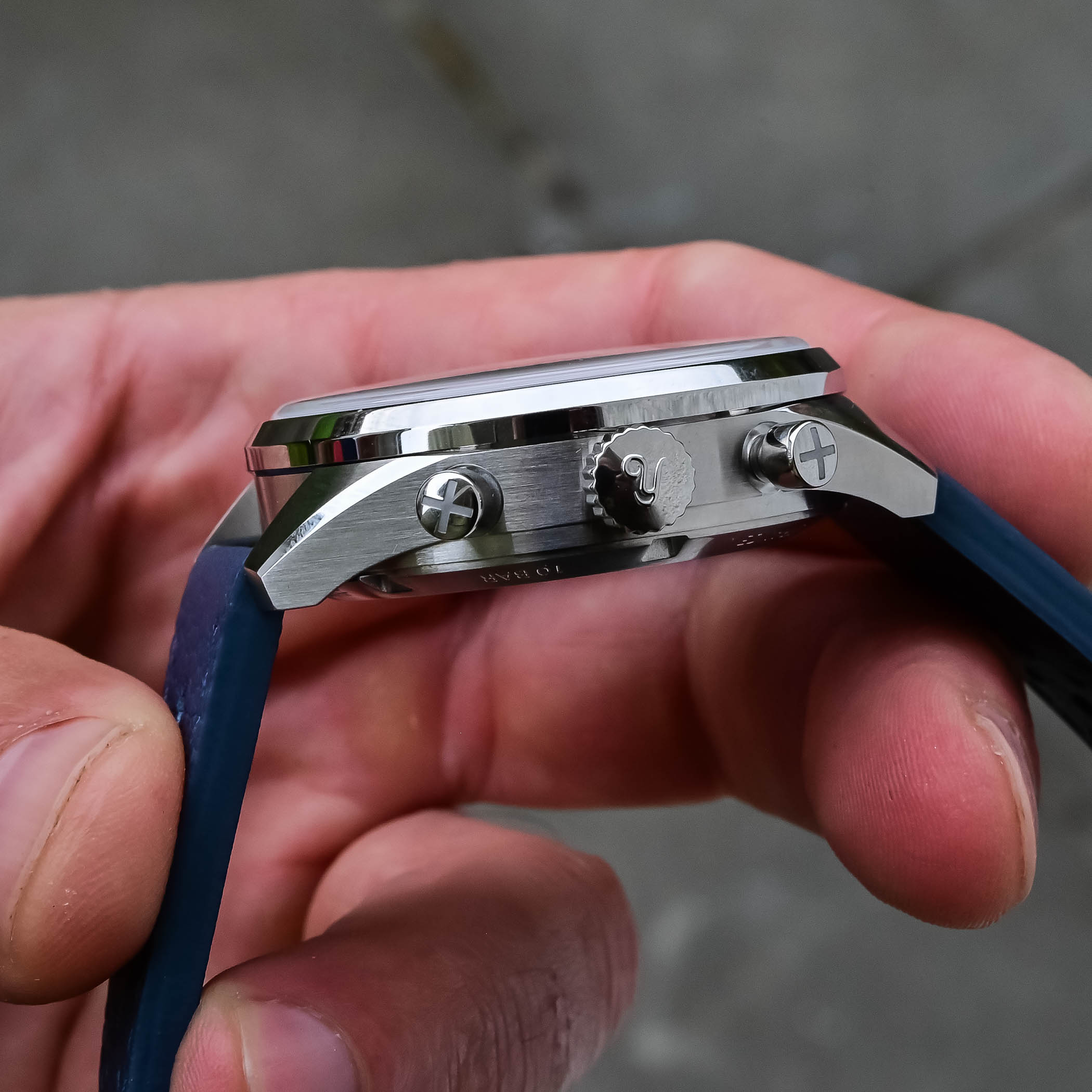 A double-domed sapphire crystal tops the case, creating attractive distortions along the edges and visually enlarging the dial aperture. Beneath it, an internal tachymeter chapter ring replaces the fixed outer scale, improving legibility and lending the watch a more contemporary precision-instrument feel.