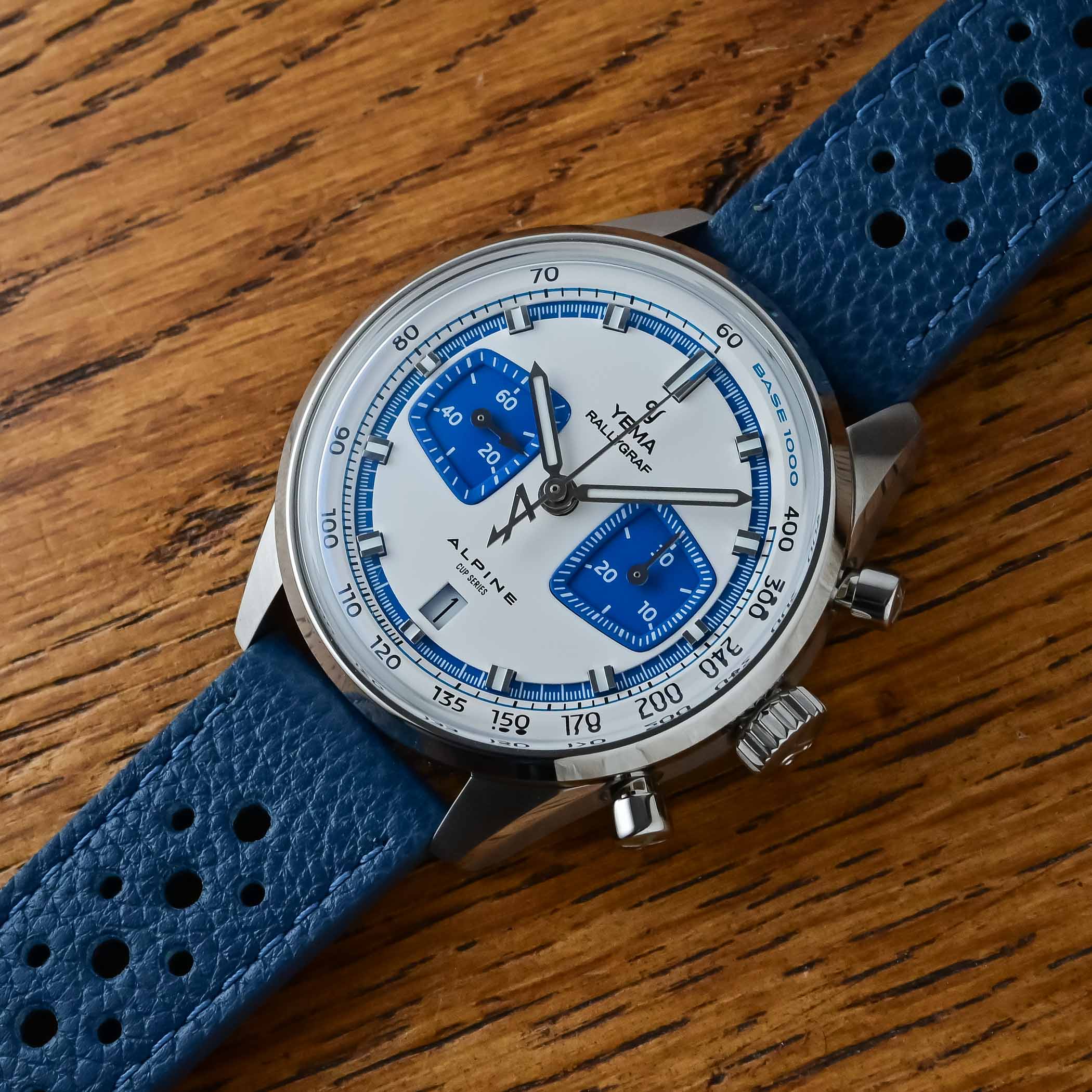 The solid caseback bears a high-pressure stamping of the Alpine A110 emblem, with each watch individually numbered 000/100. The watch is offered on a French-made perforated rally strap in Alpine blue leather, tailored to match the dial and fitted with a polished pin buckle. Each piece is assembled in France at Yema’s Morteau workshop and comes with a two-year international warranty.
