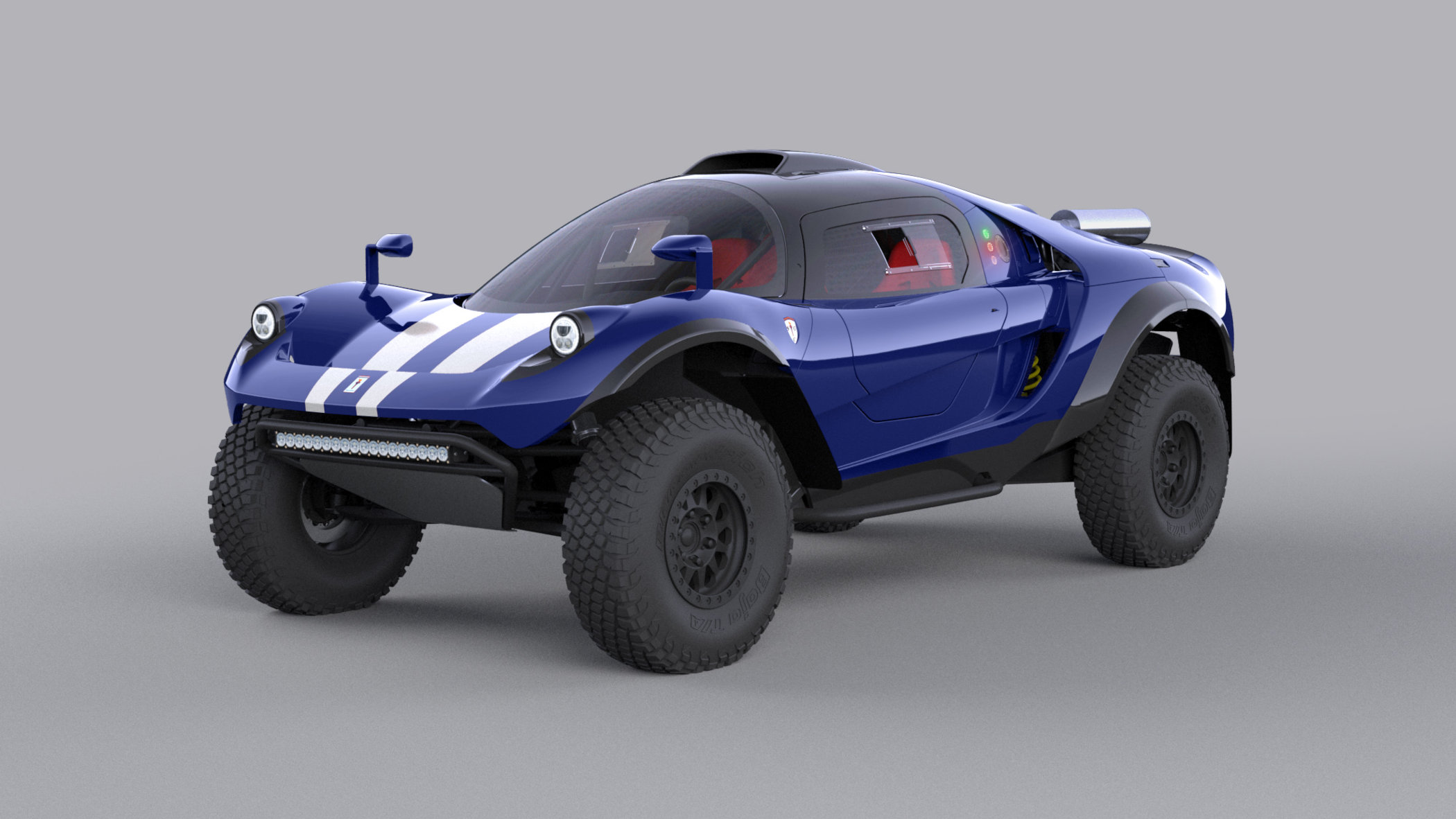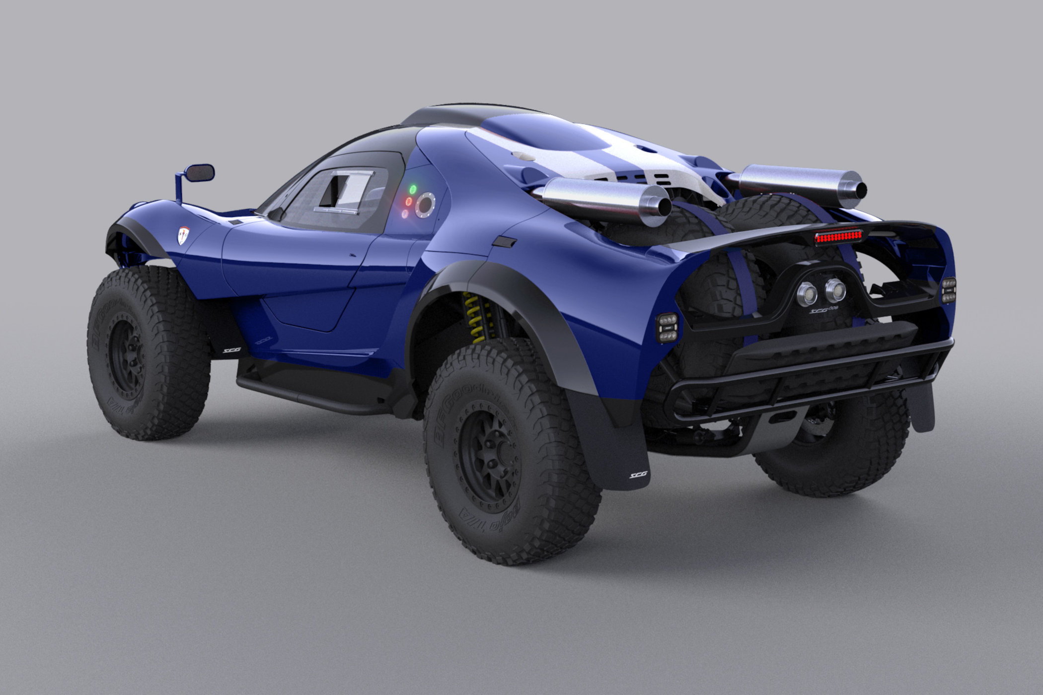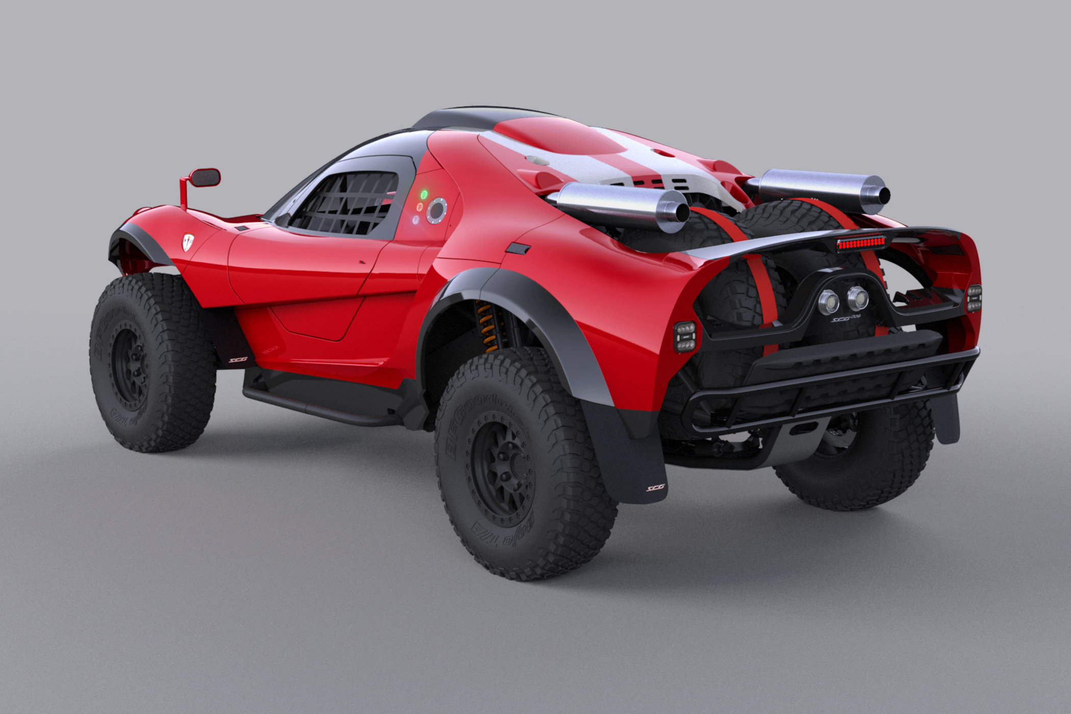 And to top it all off, you get that unique looking carbon fibre body of the SCG 004 to be draped over the chassis. This has a three-seater layout with the driver seated in the middle, and a glass canopy provides excellent visibility. The body includes an integrated front aero-spoiler, top-mounted exhausts, butterfly doors, a roof-scoop, a large rear spoiler and space for spare tires. Off course, the body is altered here and there to accommodate the large off-road wheels and tires it needs, but it still looks the part!