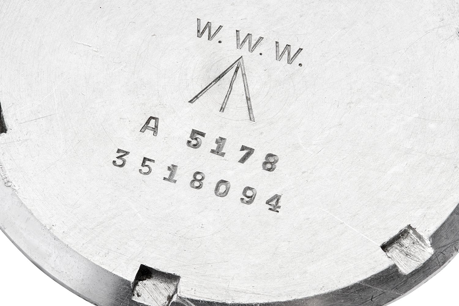 The military code for these watches was W.W.W. (Watch, Wristlet, Waterproof). They were also required to be engraved in three places with the Broad Arrow or Pheon (which denotes property of the British Crown.) On their casebacks was the descriptive code W.W.W. Two serial numbers could be found as well, one being the civil serial number of the manufacturer and the second a military one which started with a capital letter.