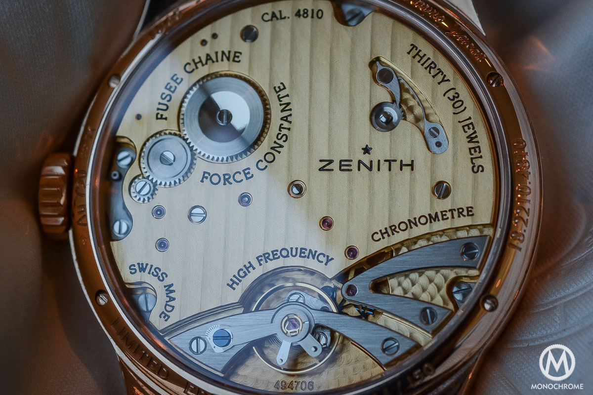 The other interesting features comes from the escapement itself, as the Zenith Academy Georges Favre-Jacot has Zenith’s typical high-frequency mechanism. The hand-wound El Primero 4810 movement ticks at 5hz / 10 beats per seconds / 36.000 bph. The main interest is that the higher the frequency, the better the precision. Combined with the constant force fuse-chain mechanism, we can expect the Zenith Academy to be both precise at a certain moment and accurate over its whole power reserve.