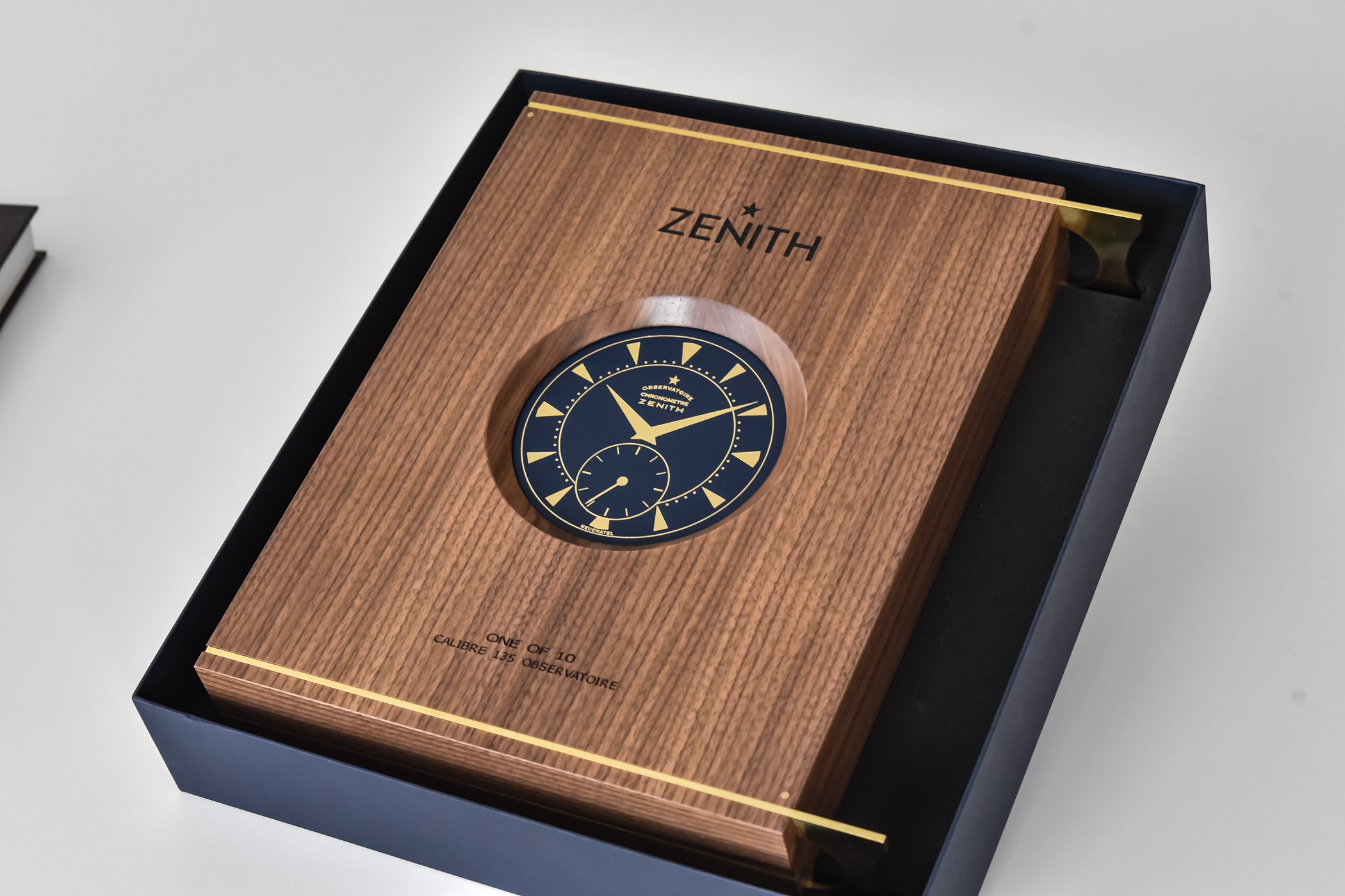The Zenith Calibre Observatoire is worn on a black calfskin leather strap. It is delivered in a walnut wood box with brass fasteners, inspired by the containers in which the chronometry competition calibres were transported from the Zenith Manufacture to the Neuchâtel Observatory.