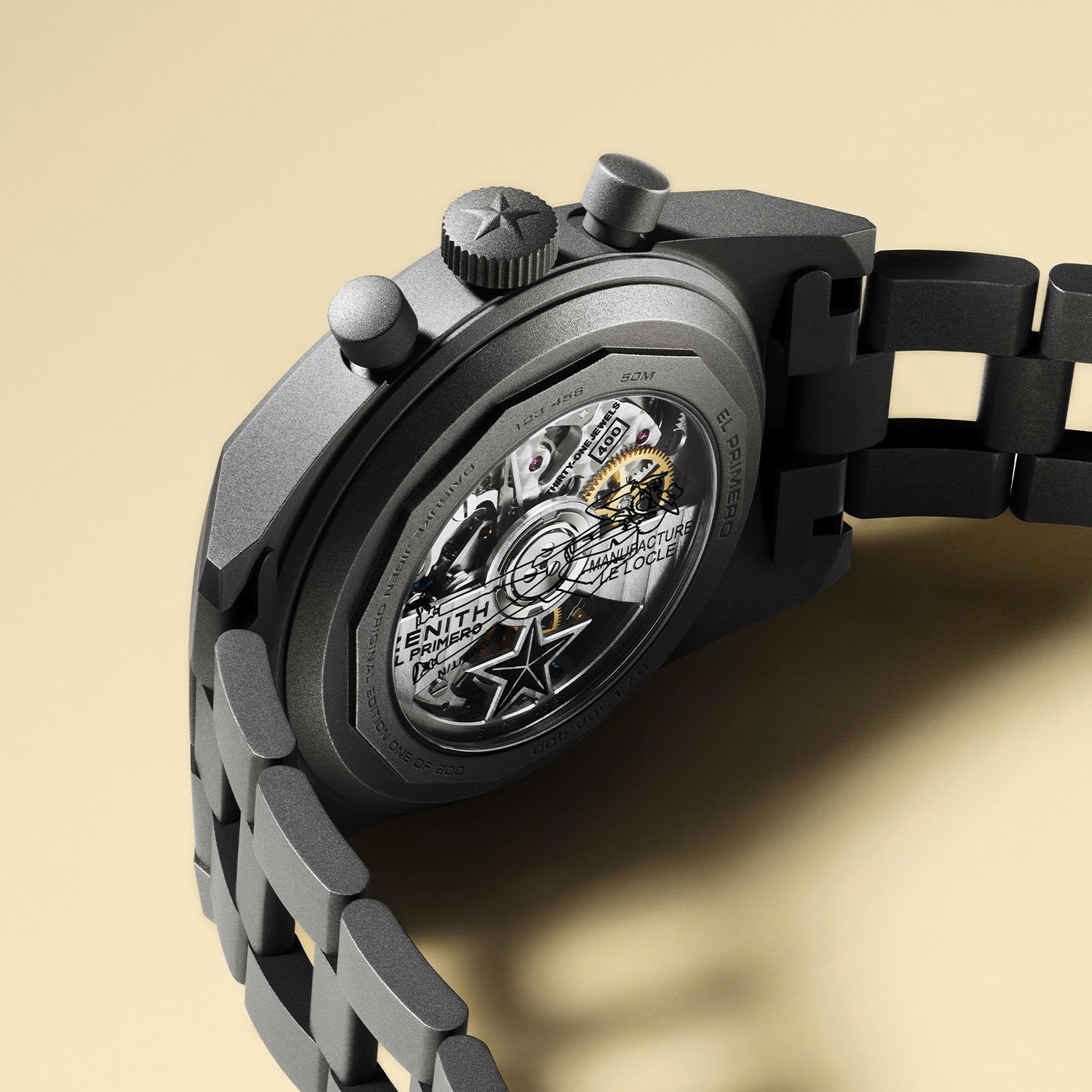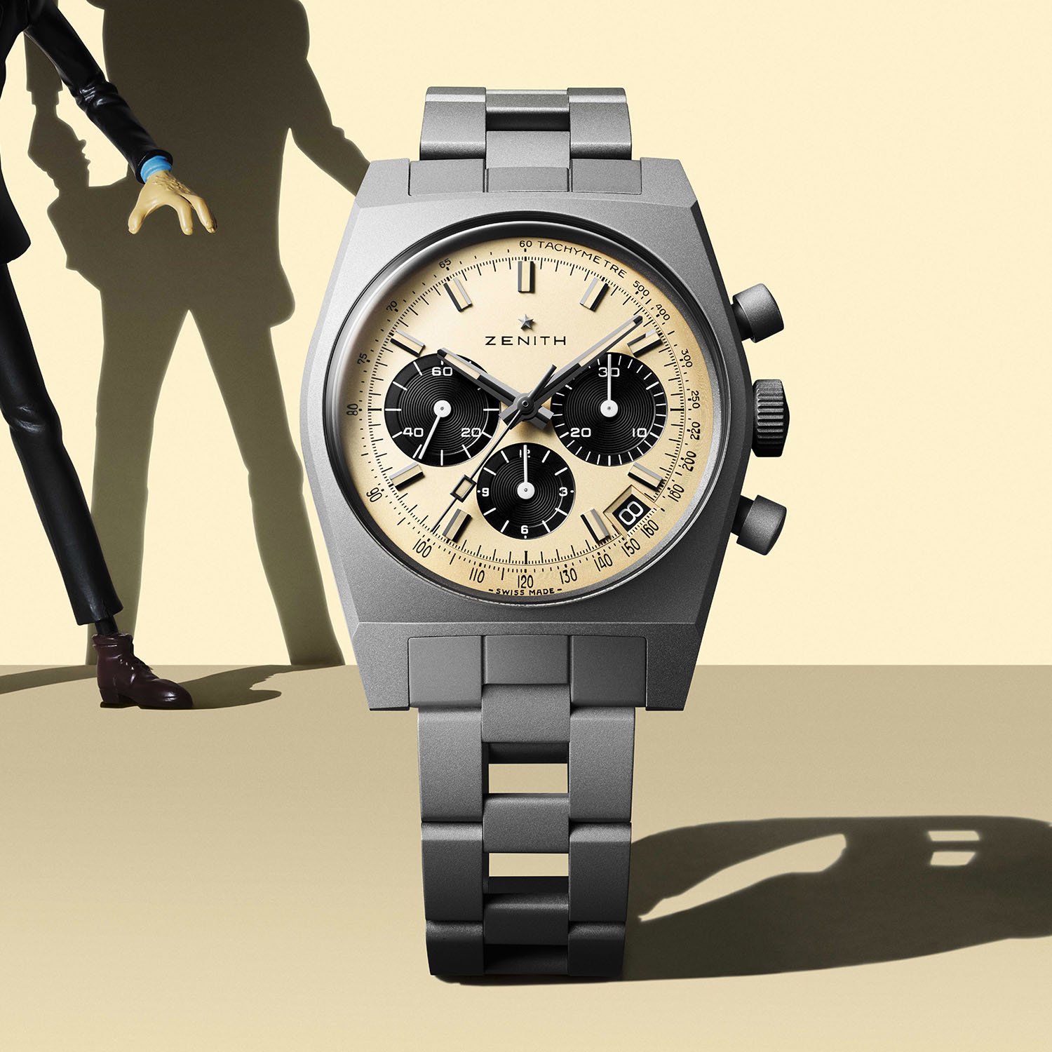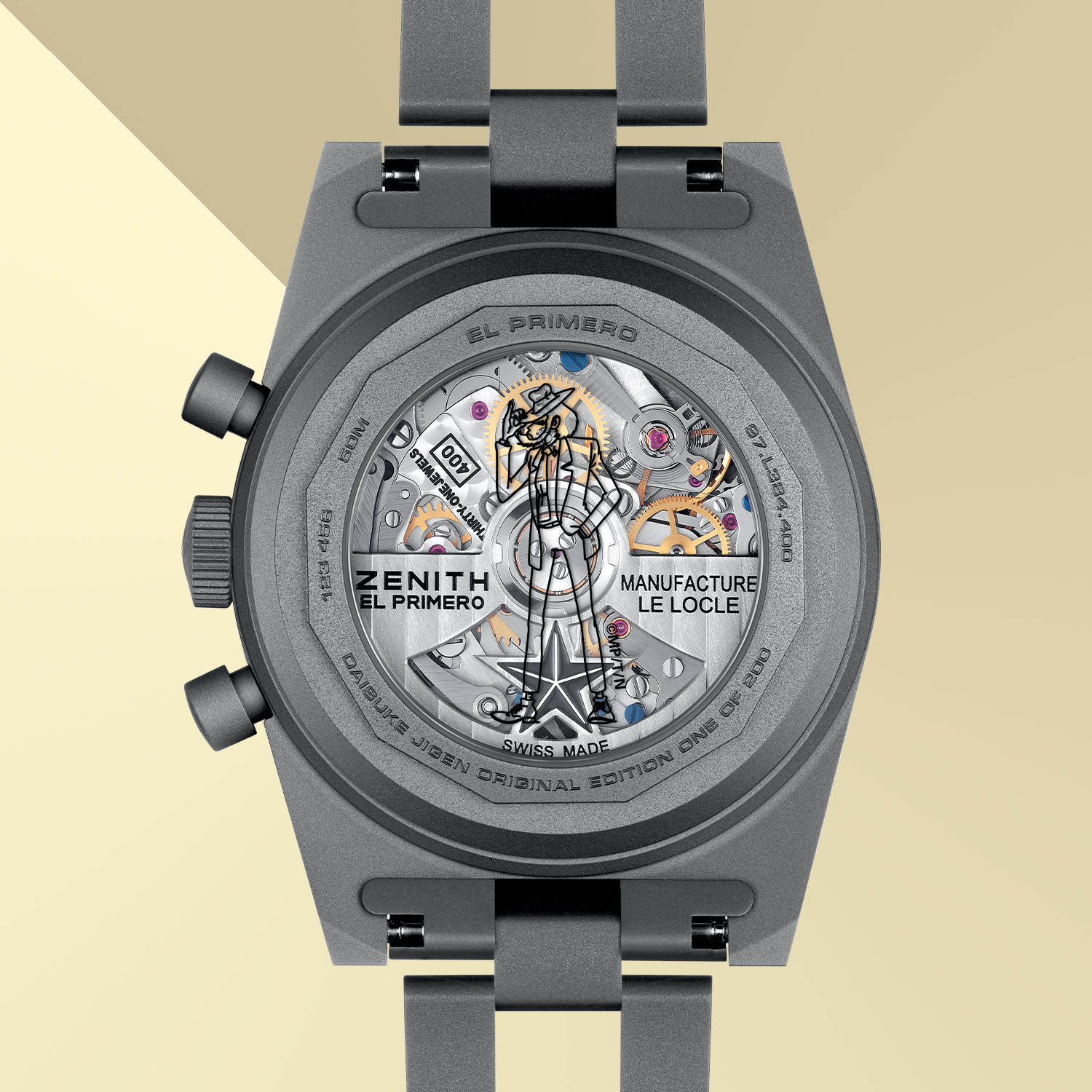 The El Primero 400 calibre keeps the link to 1969 intact. Developed and manufactured in-house, this integrated column-wheel chronograph runs at 36,000 vibrations/hour, measures elapsed time to a tenth of a second and offers a power reserve of 50 hours. On the caseback, the movement’s familiar architecture sits beneath the anime nod to Jigen. The watch is offered on Zenith’s signature ladder bracelet, originally designed by Gay Frères for the first El Primero models and here reinterpreted in microblasted titanium to match the case.