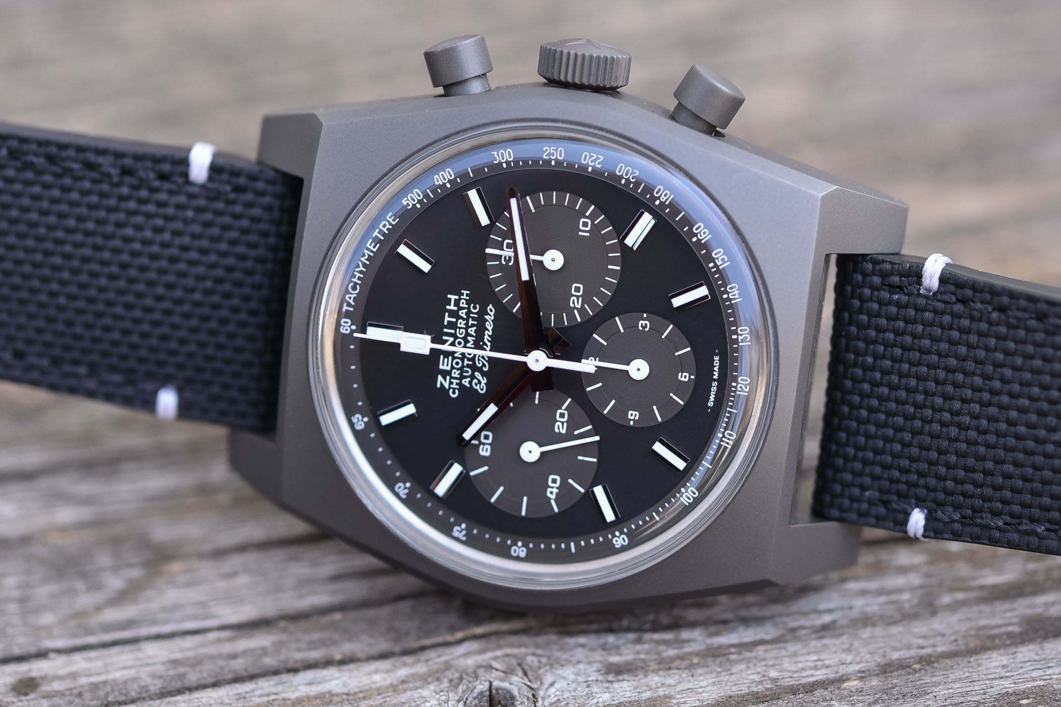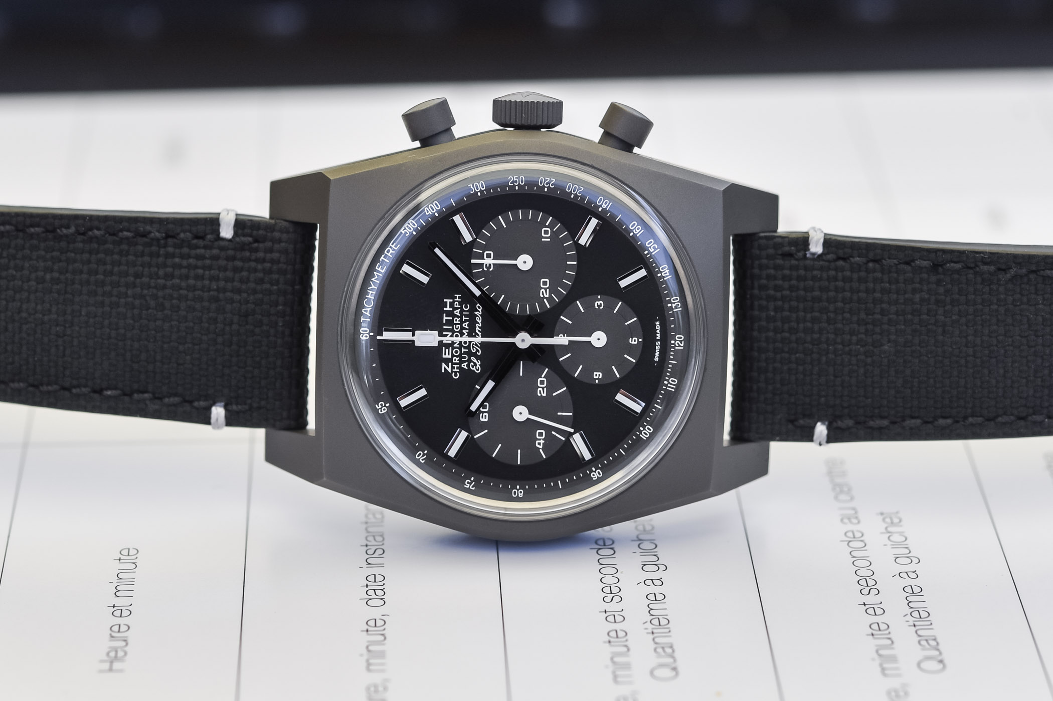 The Zenith Chronomaster Revival El Primero A384 Shadow is worn on a black rubber strap embossed with a Cordura effect and white stitching. It is fitted with a micro-blasted titanium pin buckle. It will be priced at CHF 8,400.