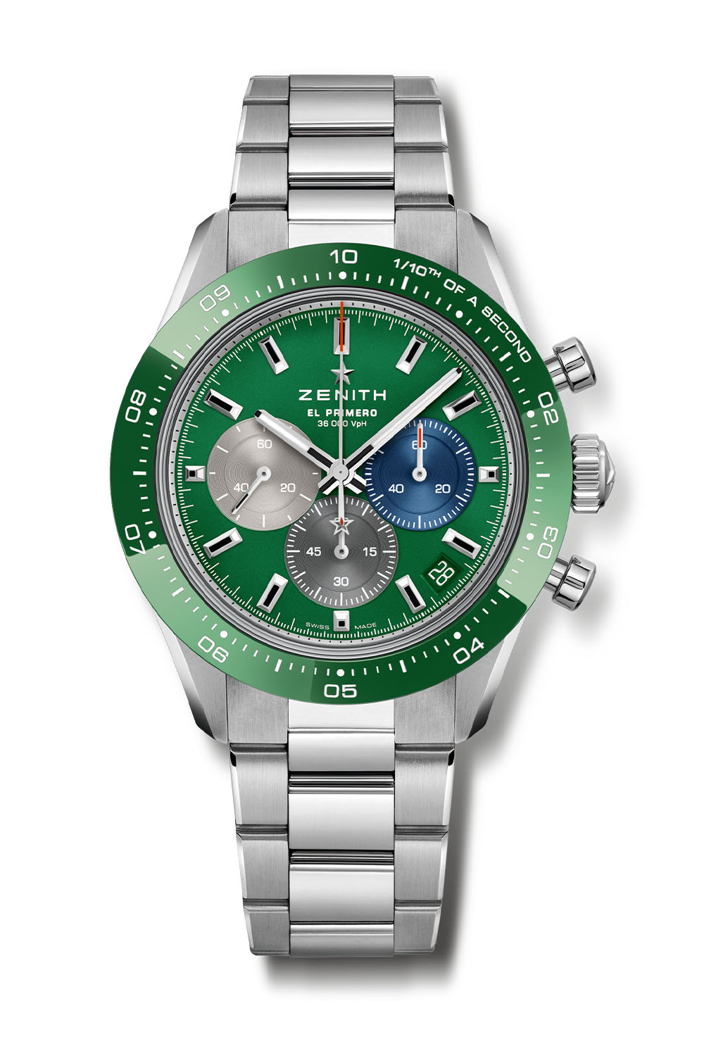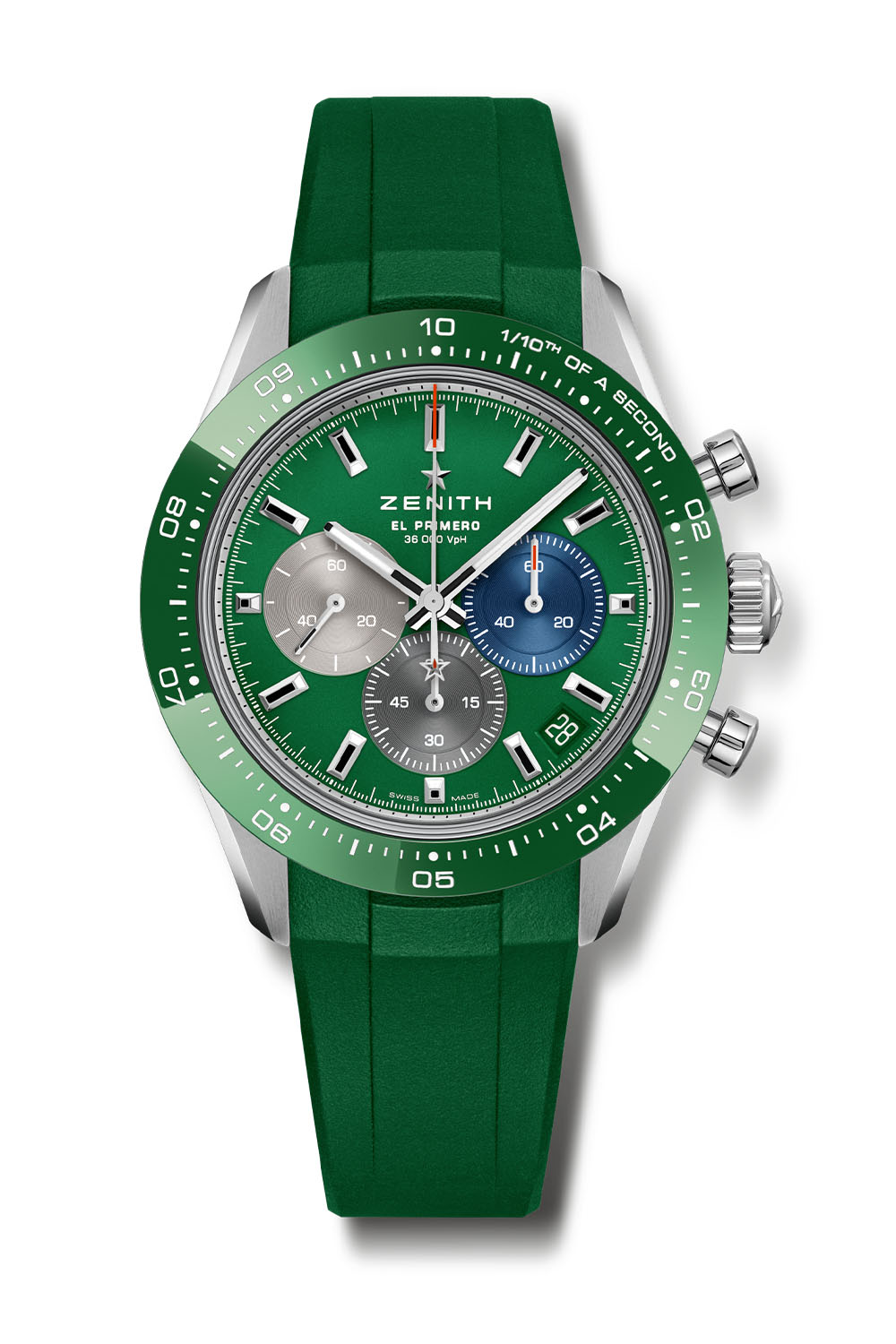 The green lacquered dial features recessed subdials – the running seconds at 9 o’clock in light grey, chronograph seconds at 3 o’clock in blue, and a 60-second counter at 6 o’clock in dark grey. Reading the chronograph involves observing the central hand adorned with a star-shaped counterweight against the green ceramic bezel for 1/10s and the small chronograph seconds subdial for elapsed seconds. The rounded-edge rectangular date window at 4:30 blends seamlessly with the dial’s colour palette. The rhodium-plated hour and minute hands, with a centre lume section, are complemented by chronograph hands featuring red tips. The rhodium-plated, faceted baton hour markers, treated with Super-LumiNova, ensure clarity, with an applied Zenith star and logo completing the dial.