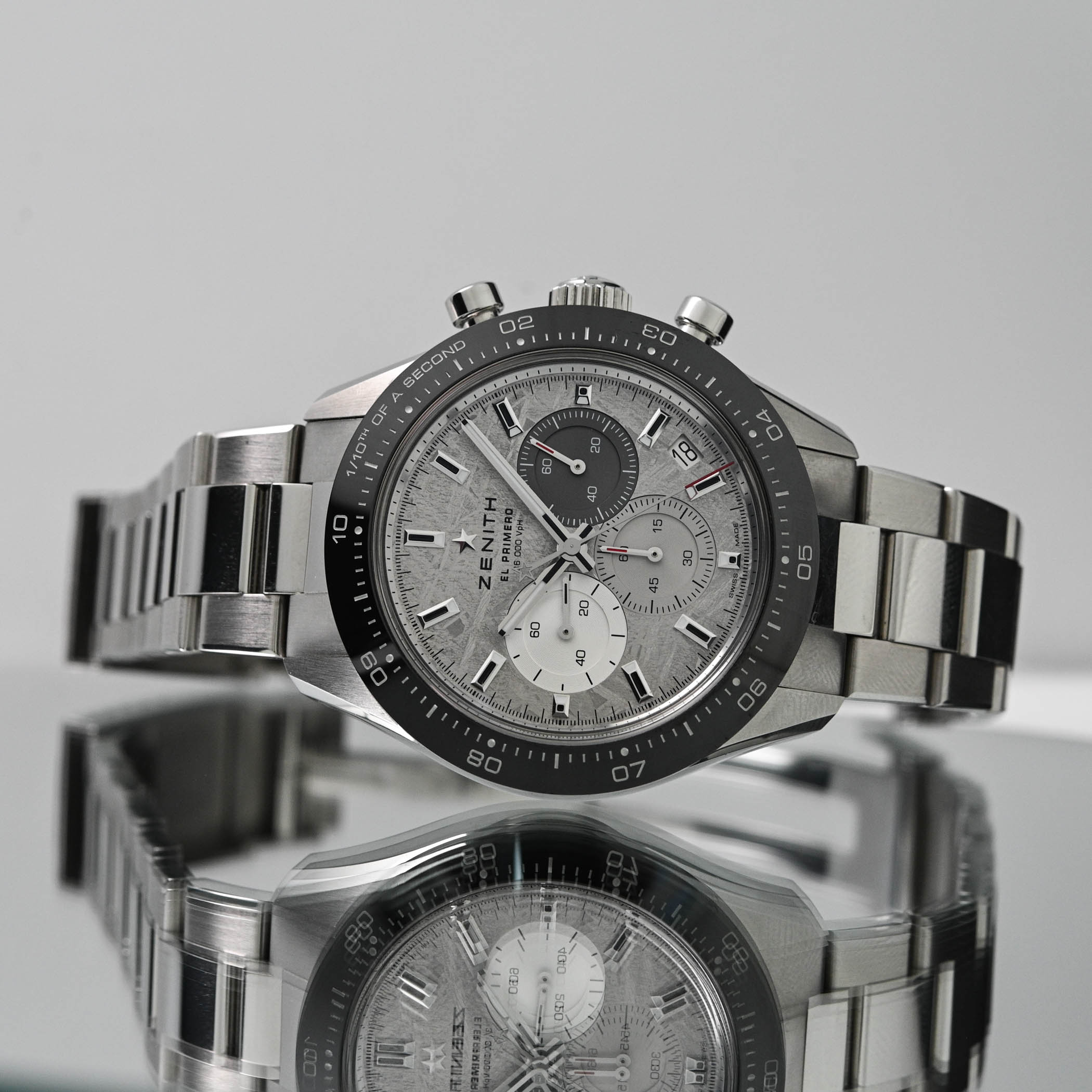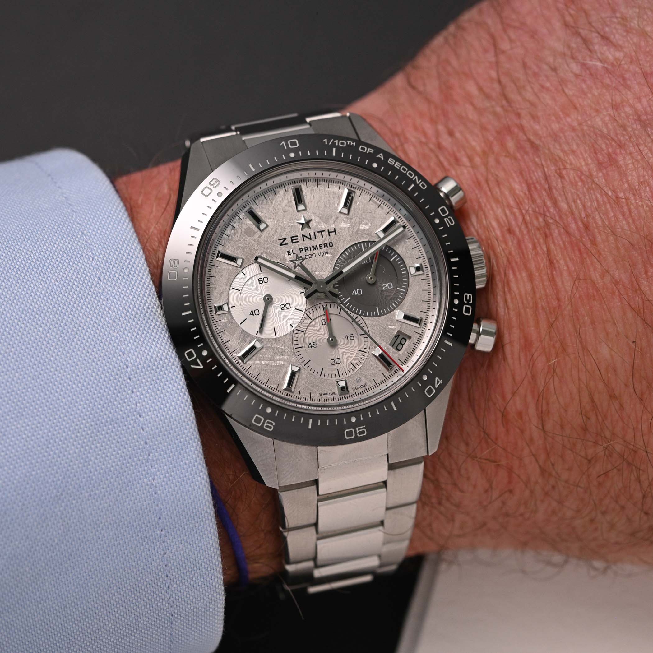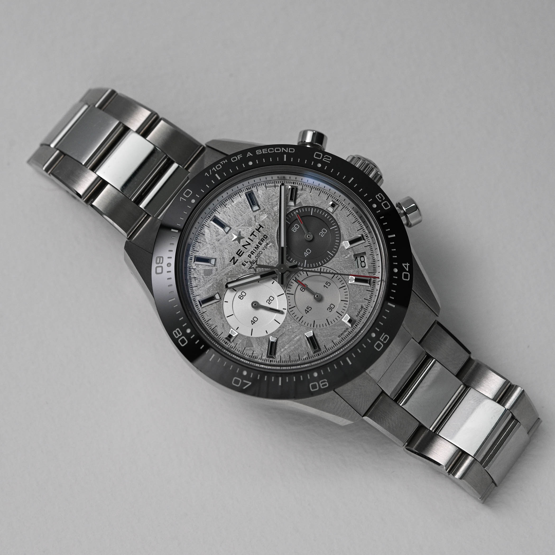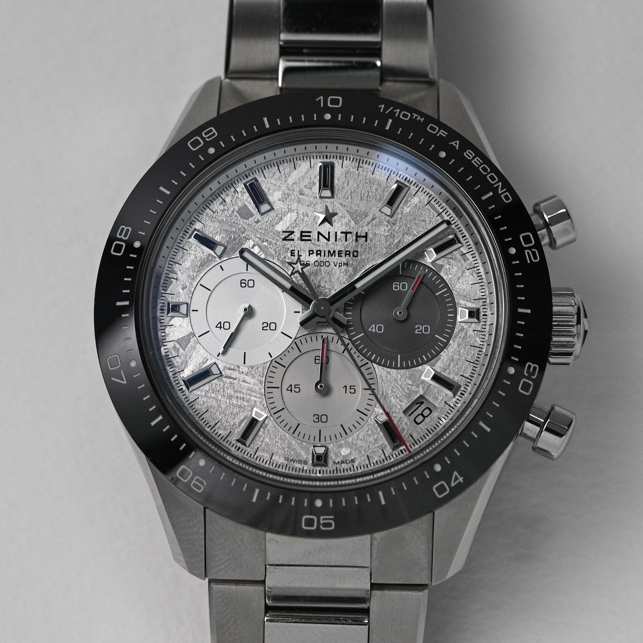 Released in 2021, the Zenith Chronomaster Sport has been quite a success for the Le Locle-based brand. A versatile sports chronograph with enough arguments, visually and mechanically, to compete with the heavyweights of the category, it has been made in an array of different versions since its introduction. Ranging from classic to bold, we’ve seen steel editions with tri-colour dials, models in pink, with green accents, with a tri-colour ceramic bezel, in titanium or with a rainbow bezel. Meteorite isn’t new to the collection either, and in fact, the model we’ll be looking at today already existed discreetly, as a Japan-only edition. Well, the steel Zenith Chronomaster Sport Meteorite is now available worldwide, and it looks quite special.