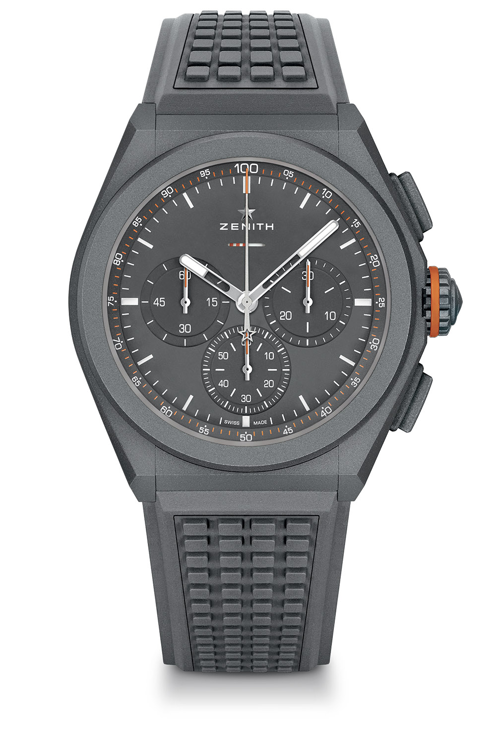 Monochromatic and matte tones are used on this Zenith Defy 21 Land Rover Defender Edition. The 44mm case retains its distinct shape, with integrated lugs and faceted casebands, but is now crafted in matte grey microblasted titanium – case, caseback, bezel, pushers and crown. Following this style, the strap is a matching grey rubber with a square pattern – note that a second grey fabric strap with orange stitchings is also included in this package.
