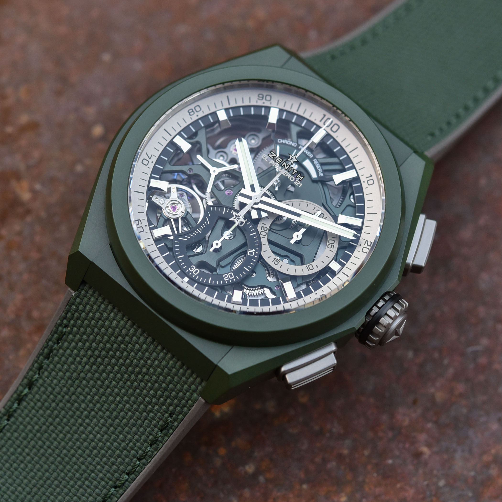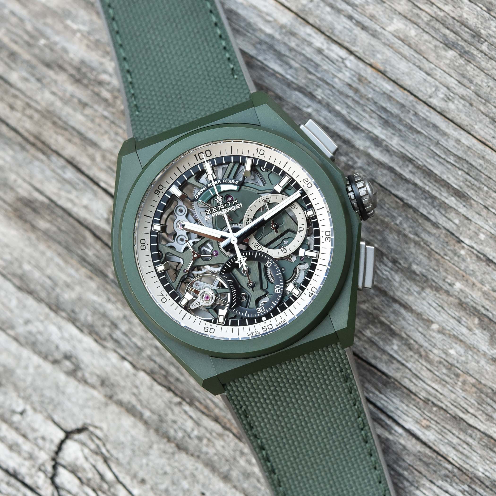 Combat-ready for action in the big city, Zenith’s high-speed Defy 21 reports for duty in military green fatigues.