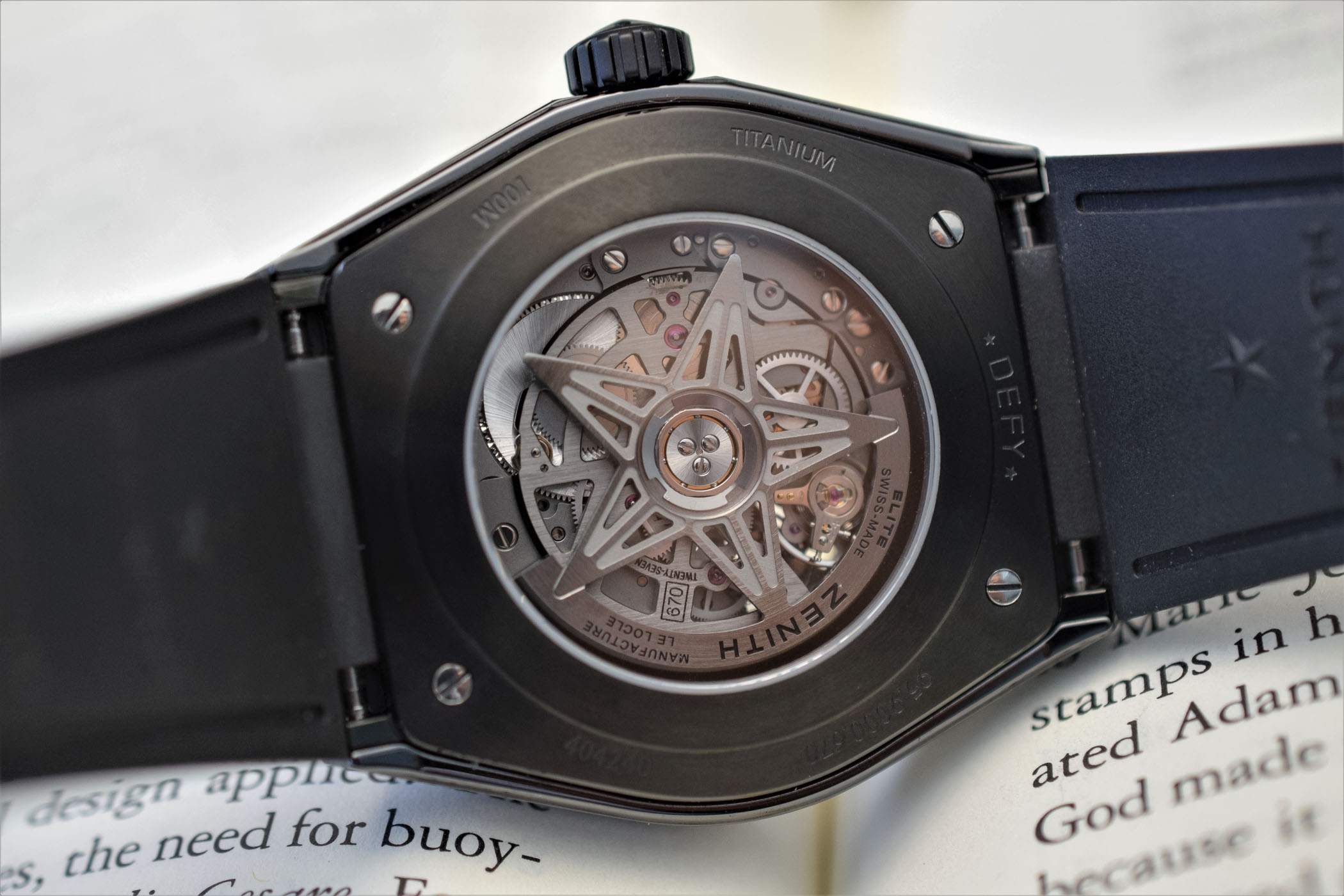 Shaped like a five-pronged star (Zenith’s logo. Personally, I see tuning forks), the dial is skeletonised offering a fascinating view of the architecture of the movement. The skeletonisation is taken to such a level that the entirety of the date wheel can be seen from the dial. The large rectangular hour markers and hands are ruthenium-plated and facetted for extra volume. In daylight, the hands and hour markers blend into one another promoting the stealth look of the watch but probably making it quite hard to read. Thankfully, the hands and hour markers are treated with a thick strip of luminescent material. At night, the luminescence emits a cool green glow. Similar to the star-shaped bridges on the dial, the central seconds hand features a star-shaped counterweight.