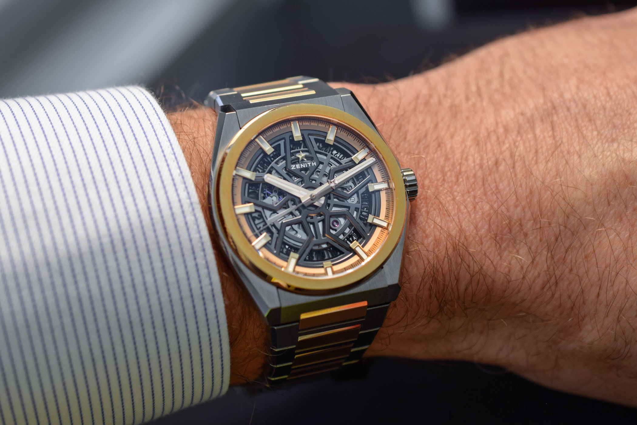Following up on its well-priced/well-executed titanium Defy Classic Skeleton from 2018, Zenith has added an embellished version with rose gold, which is also the first two-tone 41mm Defy model. The titanium bezel has been replaced with 18k rose gold along with links in the integrated titanium bracelet. The same sporty look with an edge from the Defy Classic remains intact with the two-tone version, but the upscale aesthetic is targeting a more “coat and tie” clientele. The openworked (skeleton) dial is the only option this time around, removing the second blue sunburst dial from last year’s Defy Classic. The core product may be the same, but the cosmetic changes make a big difference to the overall package. Let’s take a closer look at the Two-Tone Zenith Defy Classic.