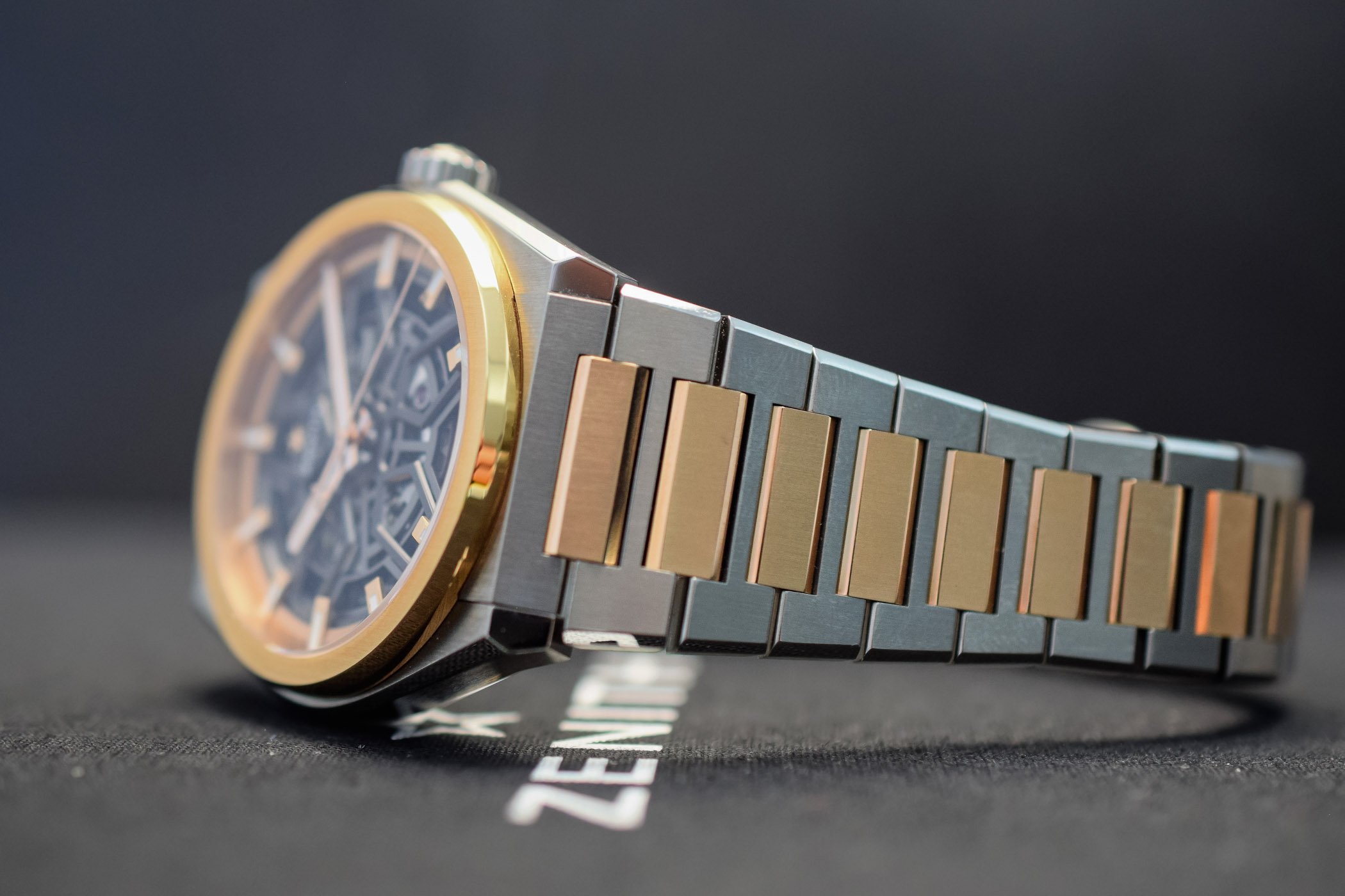 Following up on its well-priced/well-executed titanium Defy Classic Skeleton from 2018, Zenith has added an embellished version with rose gold, which is also the first two-tone 41mm Defy model. The titanium bezel has been replaced with 18k rose gold along with links in the integrated titanium bracelet. The same sporty look with an edge from the Defy Classic remains intact with the two-tone version, but the upscale aesthetic is targeting a more “coat and tie” clientele. The openworked (skeleton) dial is the only option this time around, removing the second blue sunburst dial from last year’s Defy Classic. The core product may be the same, but the cosmetic changes make a big difference to the overall package. Let’s take a closer look at the Two-Tone Zenith Defy Classic.