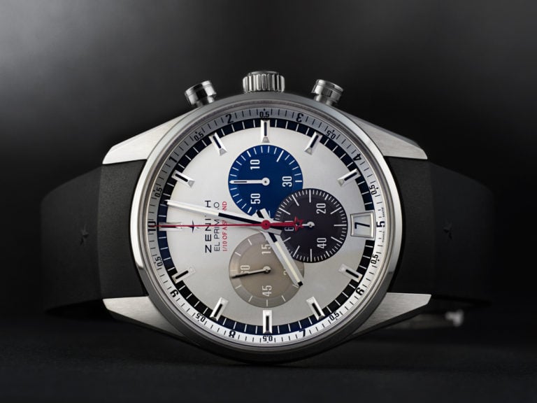 The dials are also in the vein of the Zenith production, whether we look at the standard version with silver and black dial – where we can easily recognize the style of Zenith, with the classical indexes, hands and fonts and slightly overlapping sub-dials – or on the skeletonized versions, something that has been used by the brand for some years already – this version even dares to pick up two of the colours – blue and anthracite grey – of the legendary 1969 chronograph.