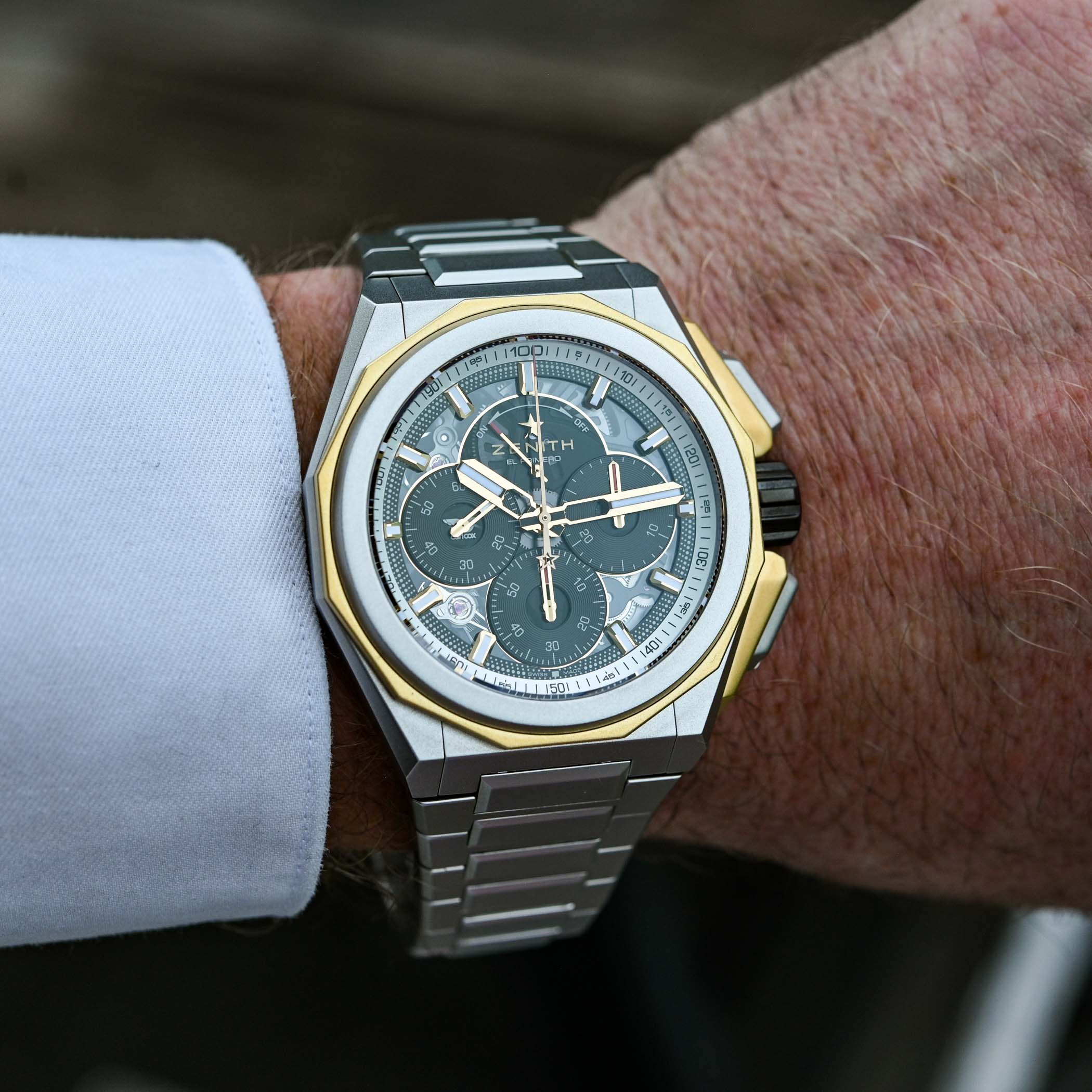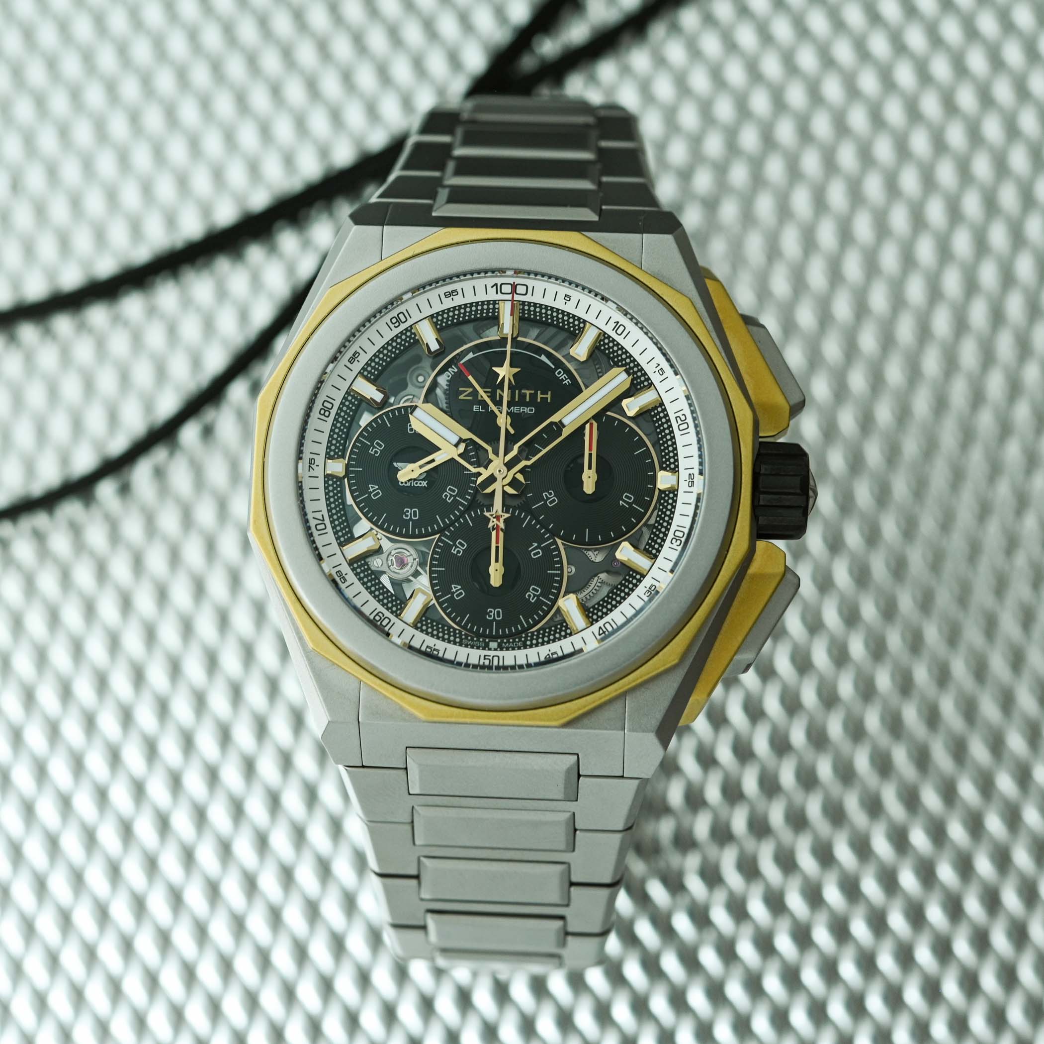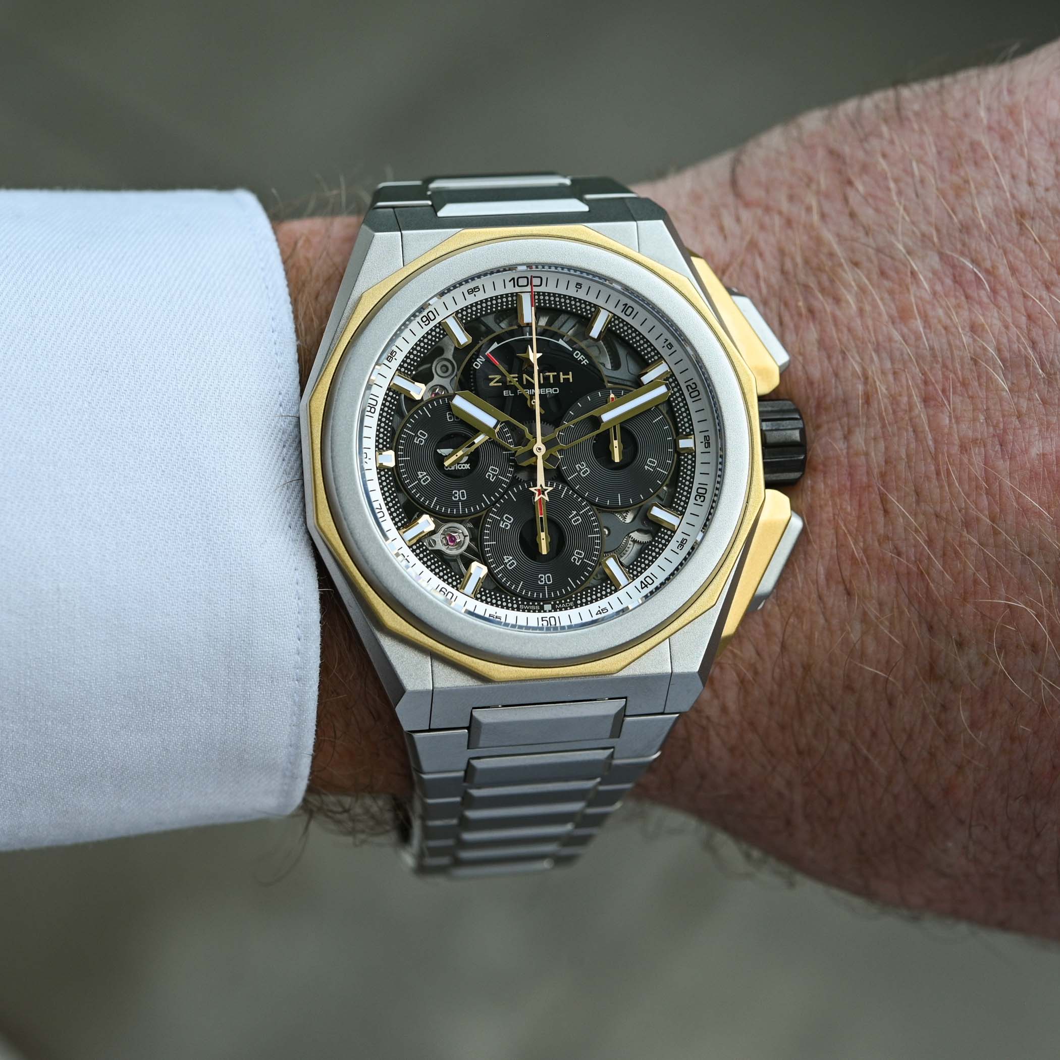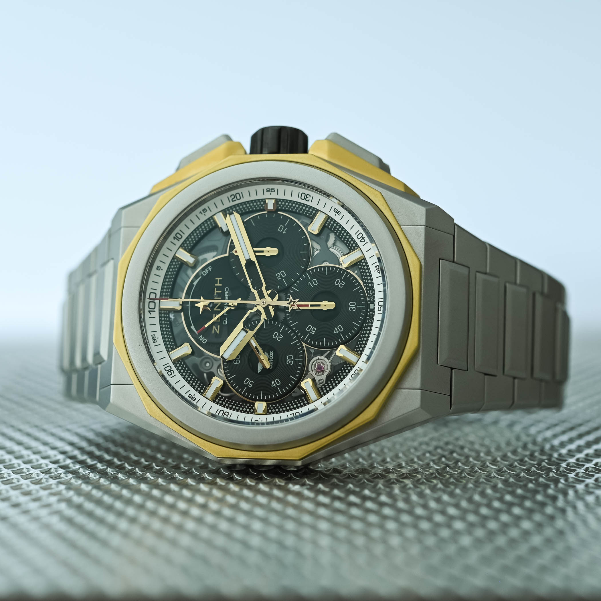 This is not the first Carl Cox Edition at Zenith. In 2020, the brand paid tribute to the DJ with a Zenith Defy 21 model in a black carbon fibre case. The latest Carl Cox timepiece comes in a far more aggressive 200m water-resistant Defy Extreme case bristling with angles and virility. Measuring 45mm across with a thickness of 15.40mm, the massive case features a mix of matte microblasted steel and yellow gold. Yellow gold is used to highlight the signature 12-sided ring underneath the bezel and for the shields protecting the chronograph pushers.