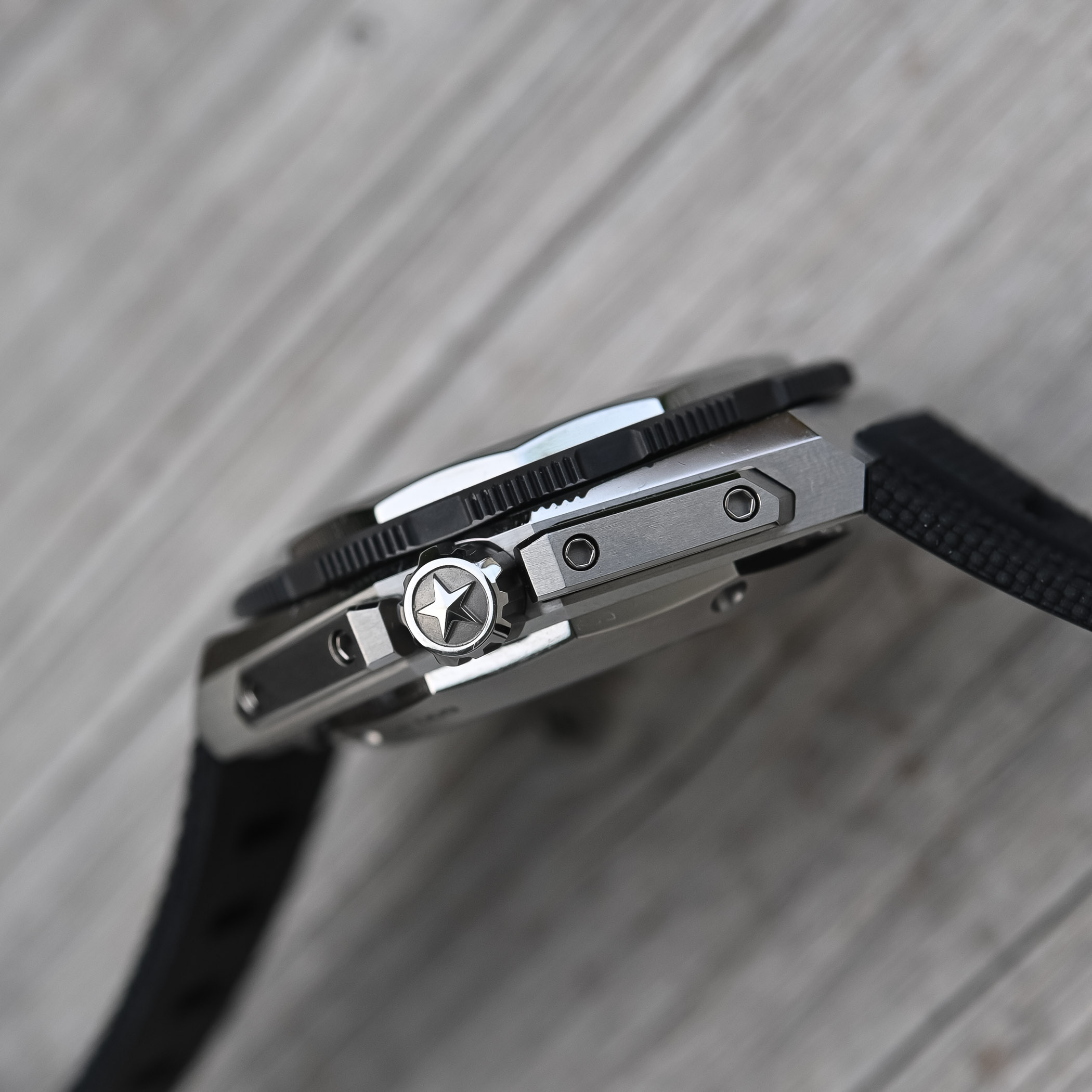 Slightly smaller than the chronographs, the case has a 42.5mm diameter but retains the characteristic 15.5mm profile. However, the case is titanium, which is robust yet lightweight and highly resistant to saltwater corrosion. Still flaunting the angular brushed guards flanking the oversized screw-down crown, the watch has a helium escape valve for saturation dives. Decorated primarily with brushed finishes, the bevels running along the flanks, pushers, and the fixed bezel are polished.