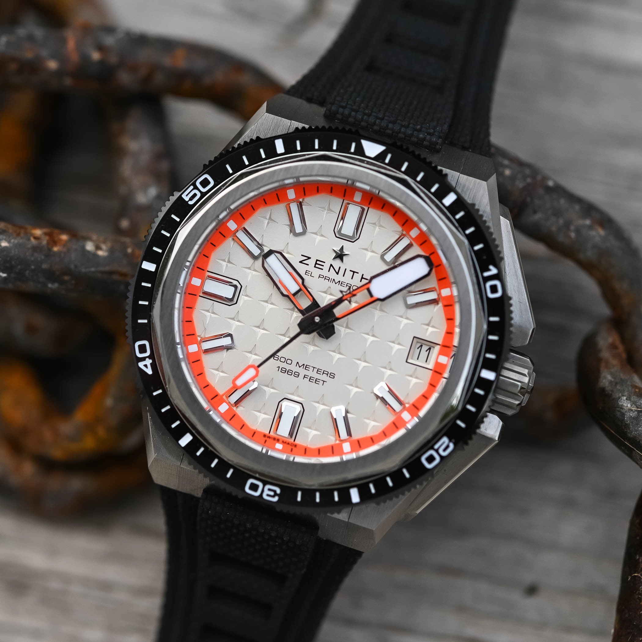 Striking for a watch with such solid depth credentials, the caseback has a sapphire window revealing the El Primero 3620-SC automatic calibre, derived from the famous El Primero 3600. Beating at a high frequency of 5Hz, it delivers a power reserve of 60 hours, has a paramagnetic escapement with silicon components, and an openworked star-shaped rotor.