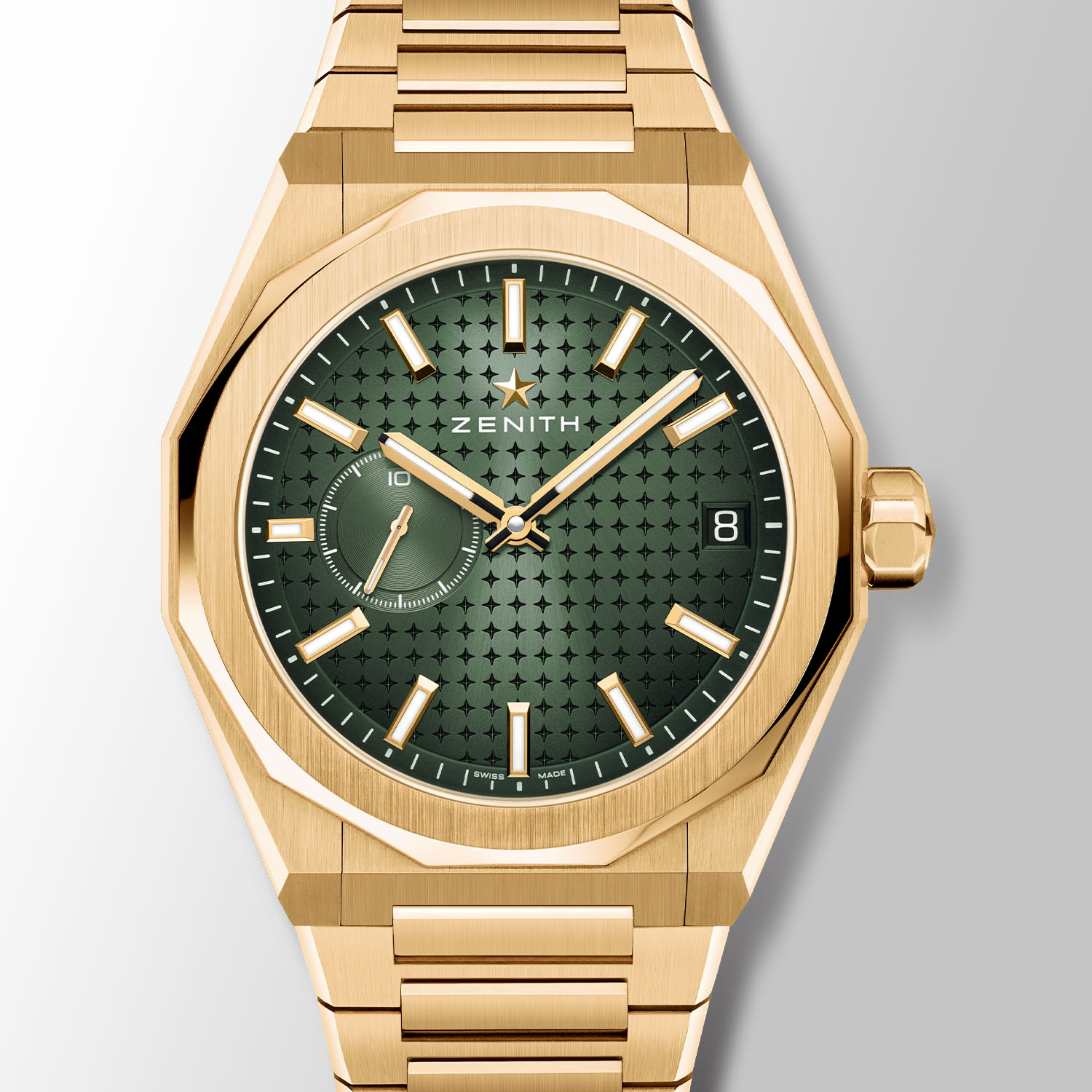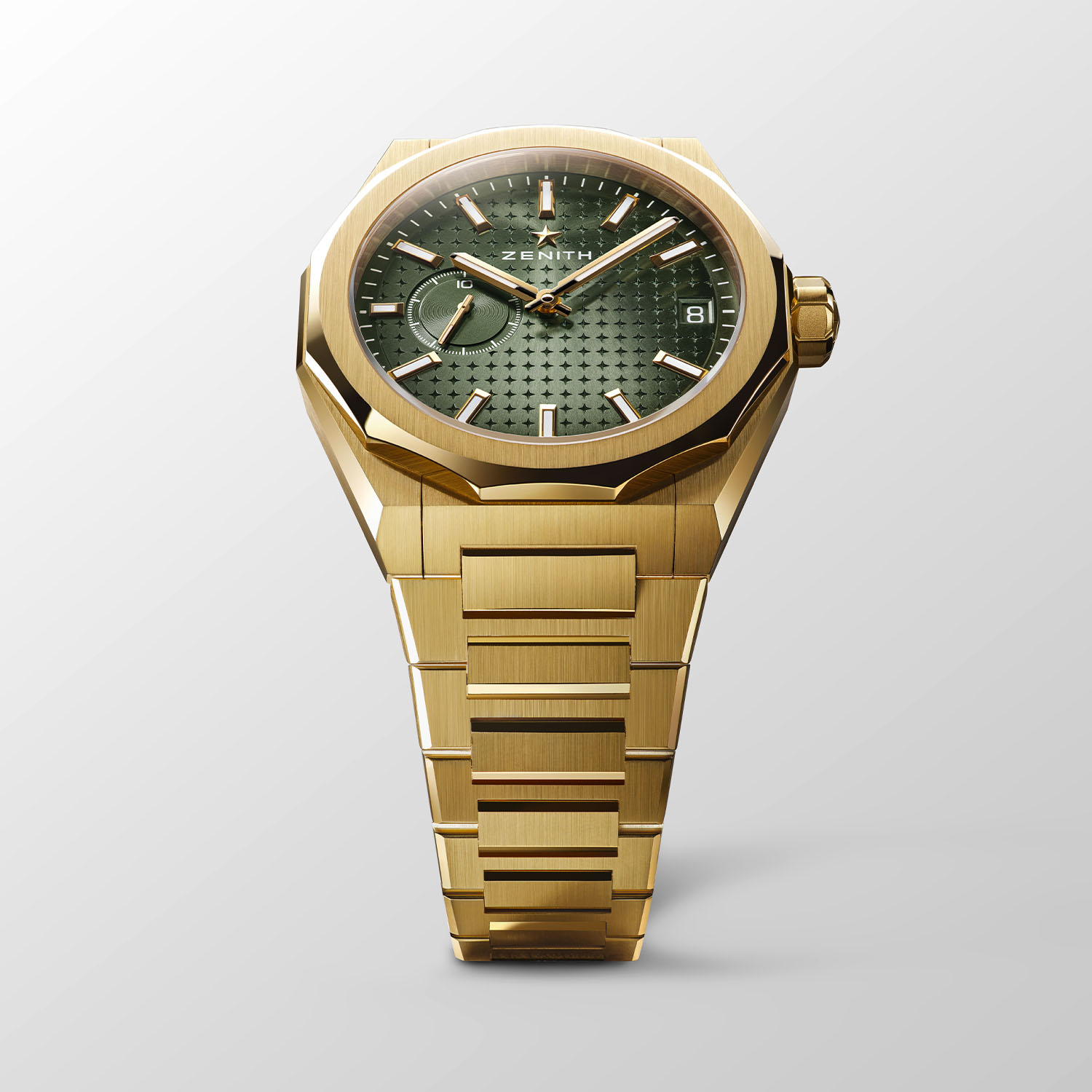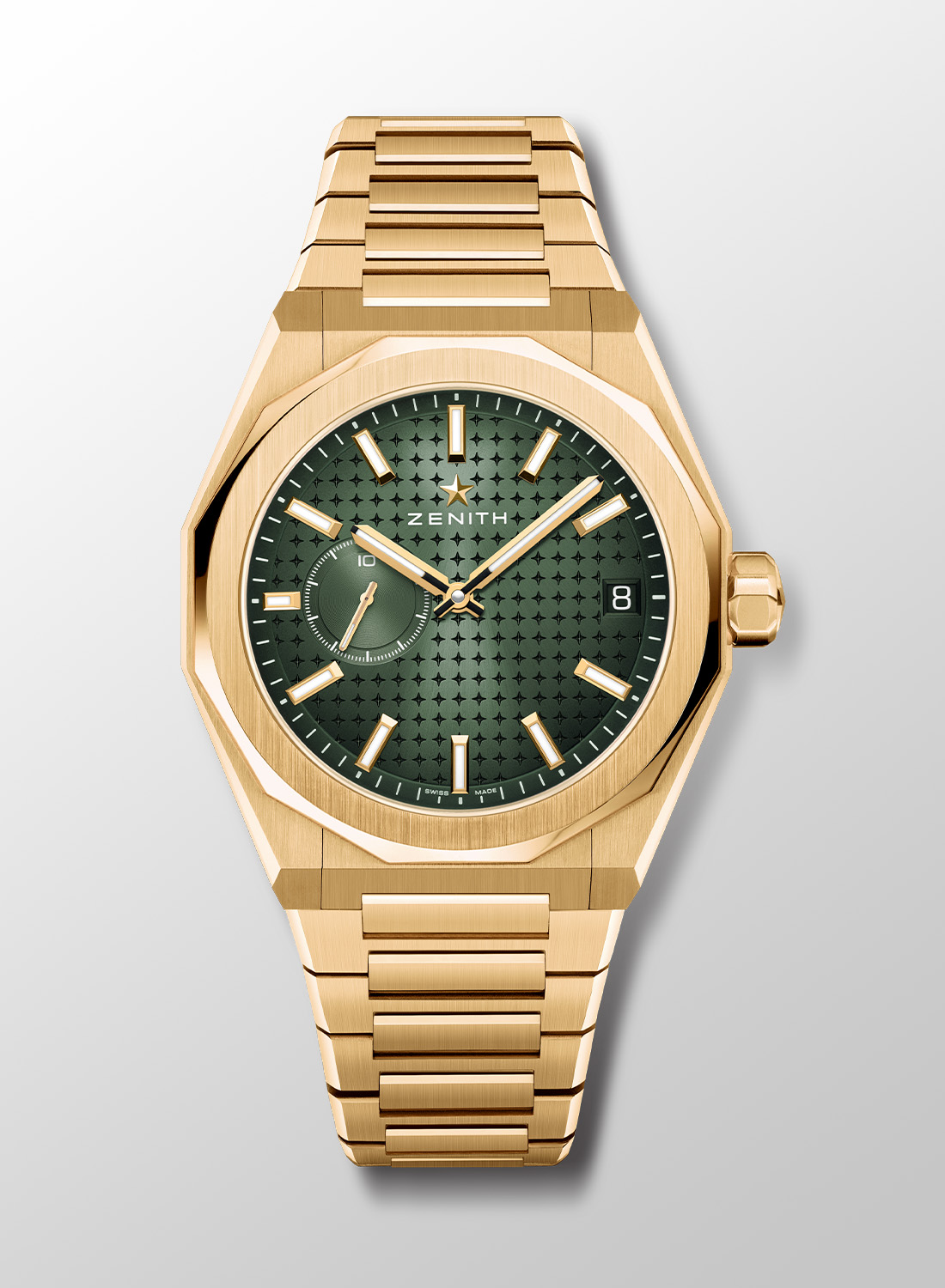 Quick facts: 41mm x 11.6mm – lug-to-lug 46.3mm – 18k yellow gold case, brushed with polished accents – screw-down crown – 100m water-resistance – olive green starry patterned dial – 1/10th of a second indication at 9 o’clock, date at 3 o’clock – indices and hands coated with SLN C1 – integrated yellow gold H-link bracelet, additional black rubber strap included – El Primero 3620 – in-house – automatic – 5Hz frequency (36,000vph) – 60h power reserve – hours and minutes, 1/10th of a second indication at 9 o’clock, date, stop-seconds function – ref. 30.9300.3620/74.l001 – CHF 59,900 / EUR 64,900 / USD 62,200