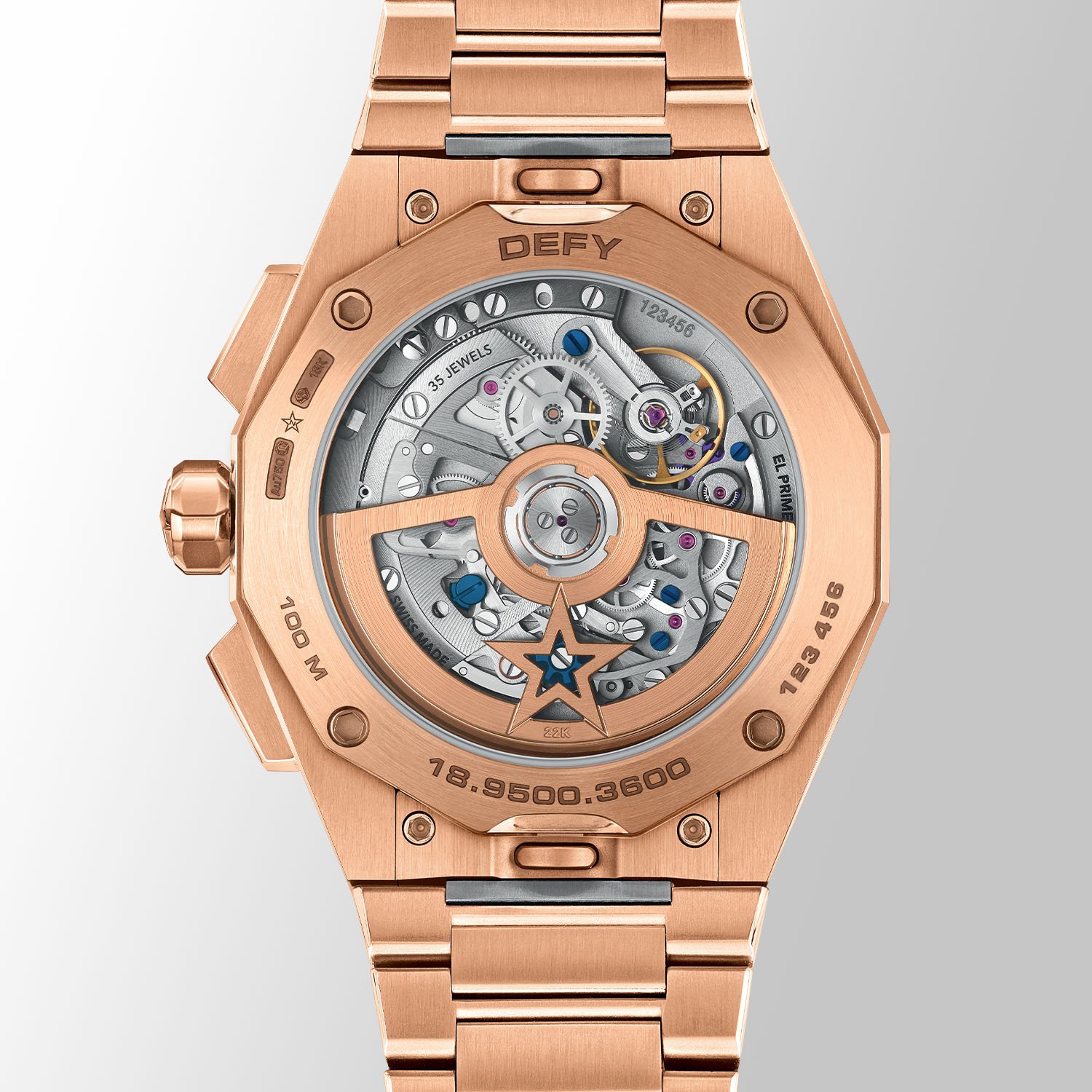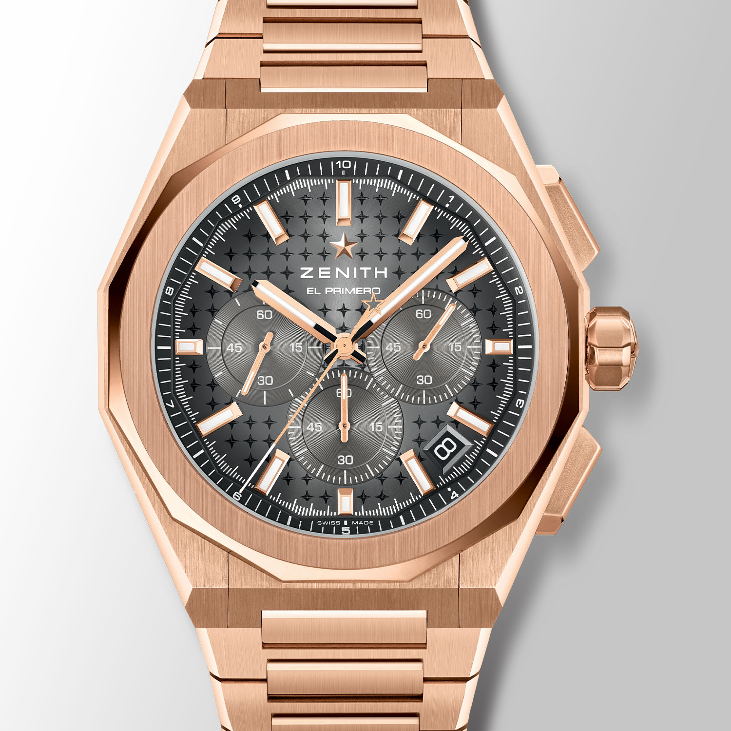 Quick facts: 42mm x 12.7mm – lug-to-lug 47.4mm – 18k rose gold case, brushed with polished accents – screw-down crown – 100m water-resistance – slate-grey gradient dial with embossed starry pattern – snailed counters – flange with 1/10th of a second markings – date window at 4:30 – indices and hands coated with SLN C1 – integrated rose gold H-link bracelet, additional black rubber strap included – El Primero 3600 – in-house – automatic – 5Hz frequency (36,000vph) – 60h power reserve – hours and minutes, 1/10th of a second chronograph indication, small seconds, 60-minute and 60-second counters, date, stop-seconds mechanism – ref. 18.9500.3600/21.I001 – CHF 64,900 / EUR 70,300 / USD 67,300