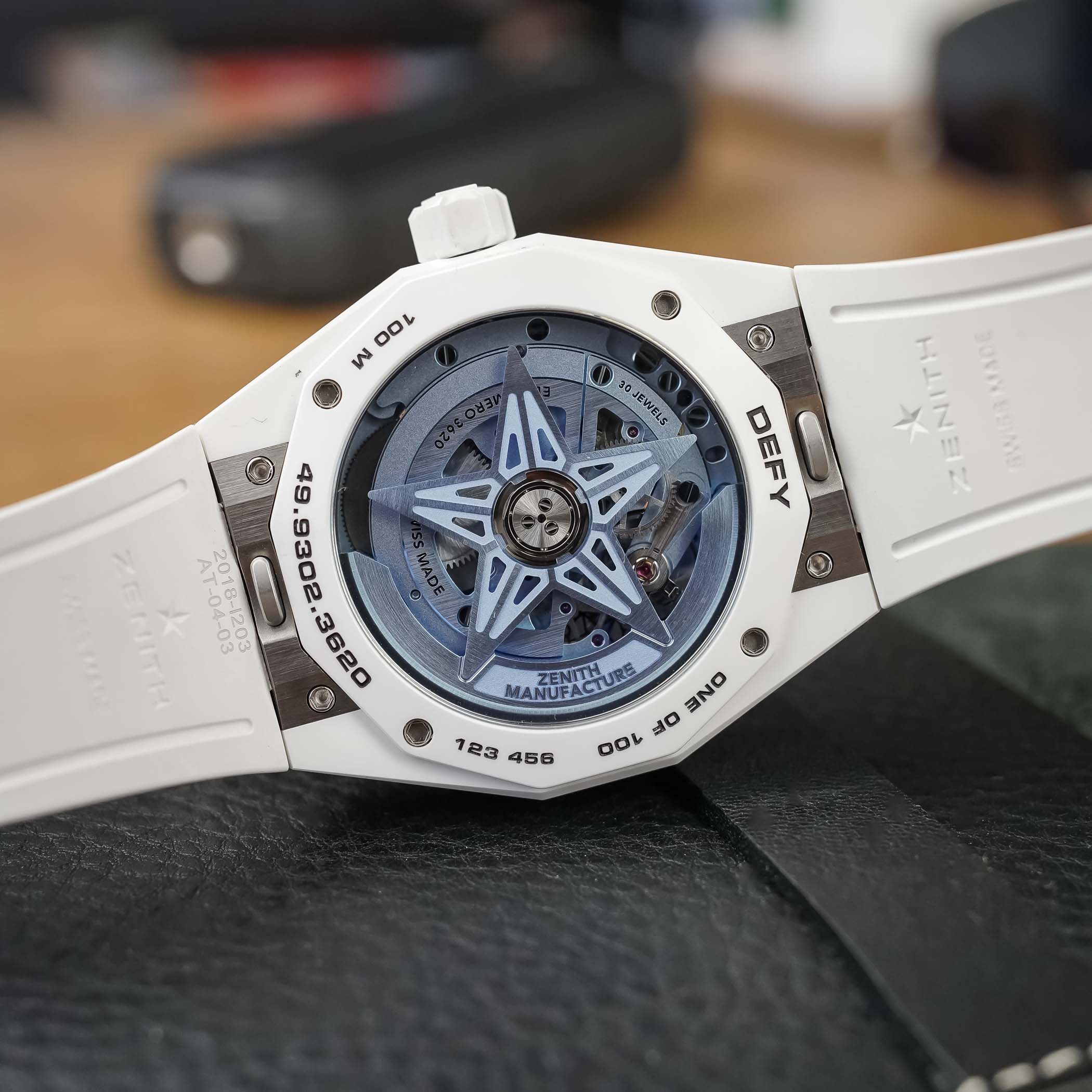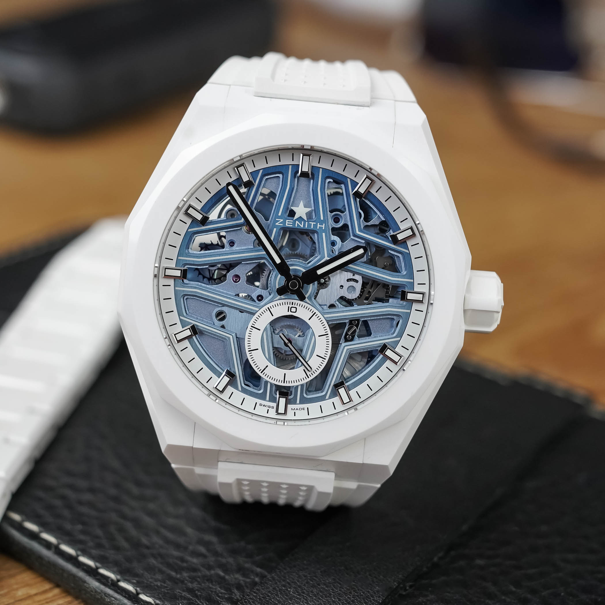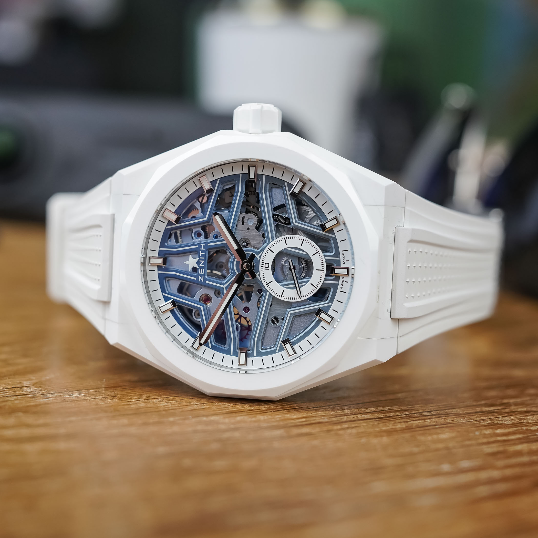 The Zenith Defy Skyline Skeleton White Surfer Ceramic is limited to 100 pieces worldwide. It is available via Time+Tide, Zenith boutiques, and authorised retailers globally. Price is CHF 18,900 or EUR 20,500. More details about the watch at shop.timeandtidewatches.co.uk and www.zenith-watches.com.