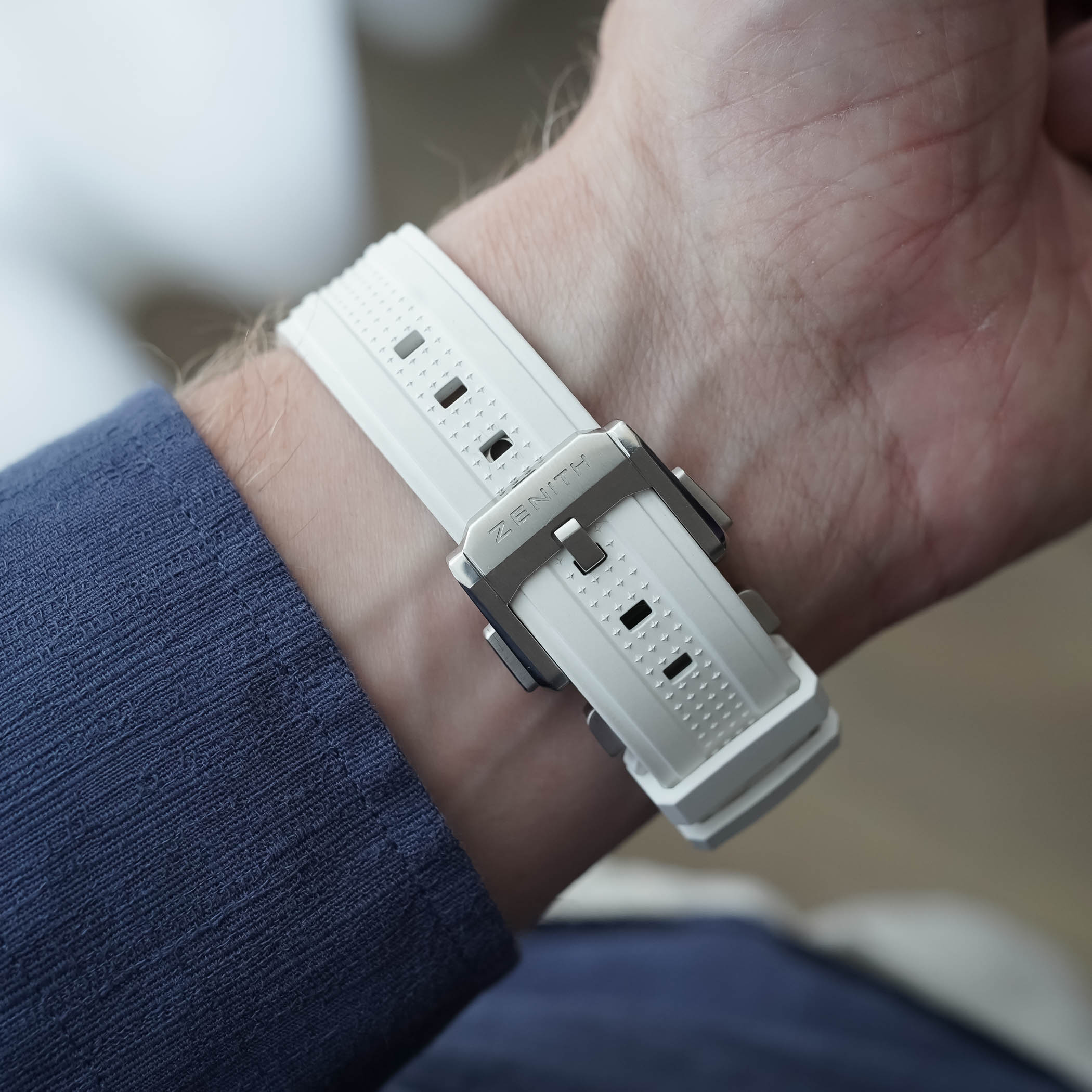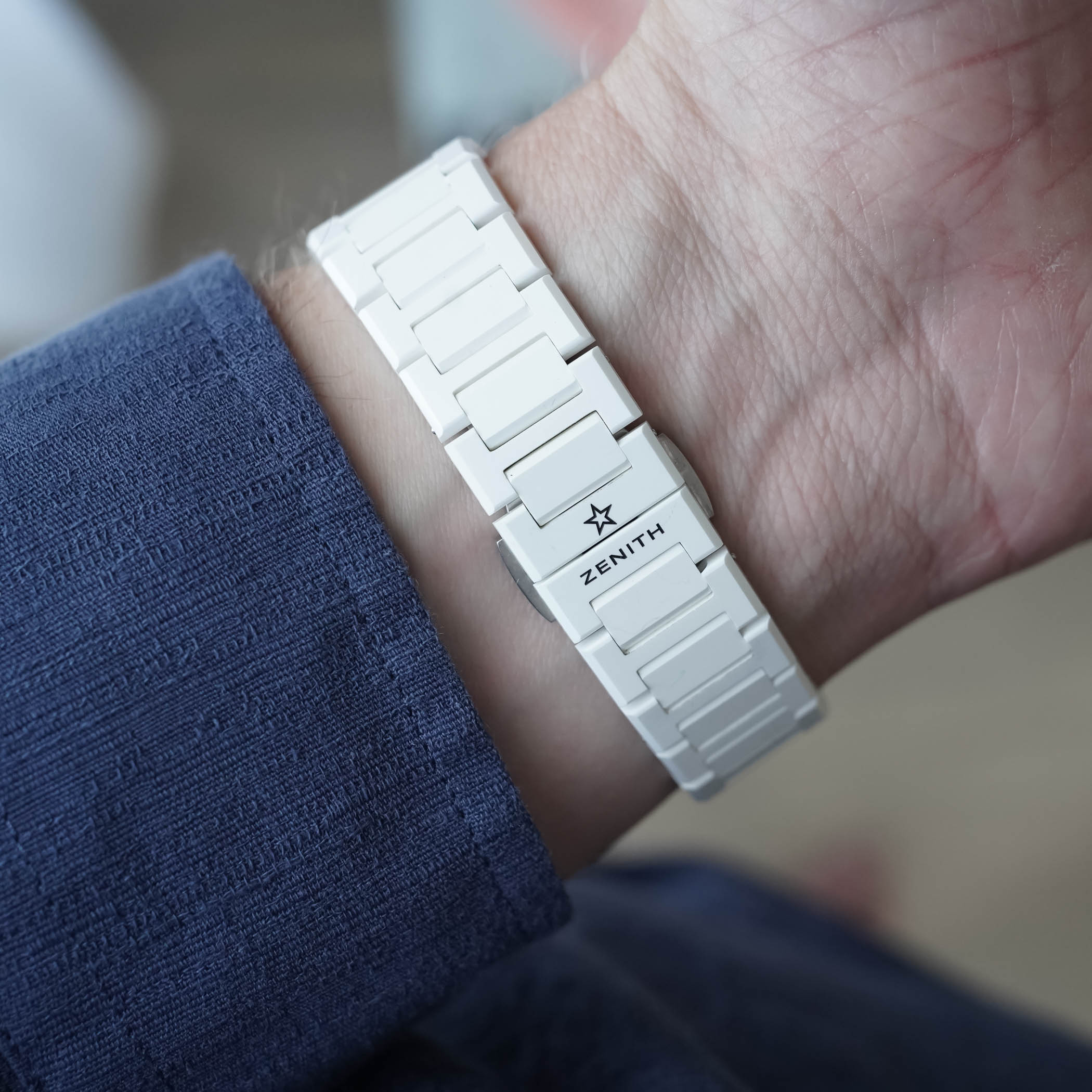 The White Surfer Ceramic by T+T is presented on an integrated white ceramic bracelet, secured by a folding clasp. A white rubber strap with a patterned surface is also included, and both the strap and bracelet can be easily swapped using Zenith’s toolless quick-change system.