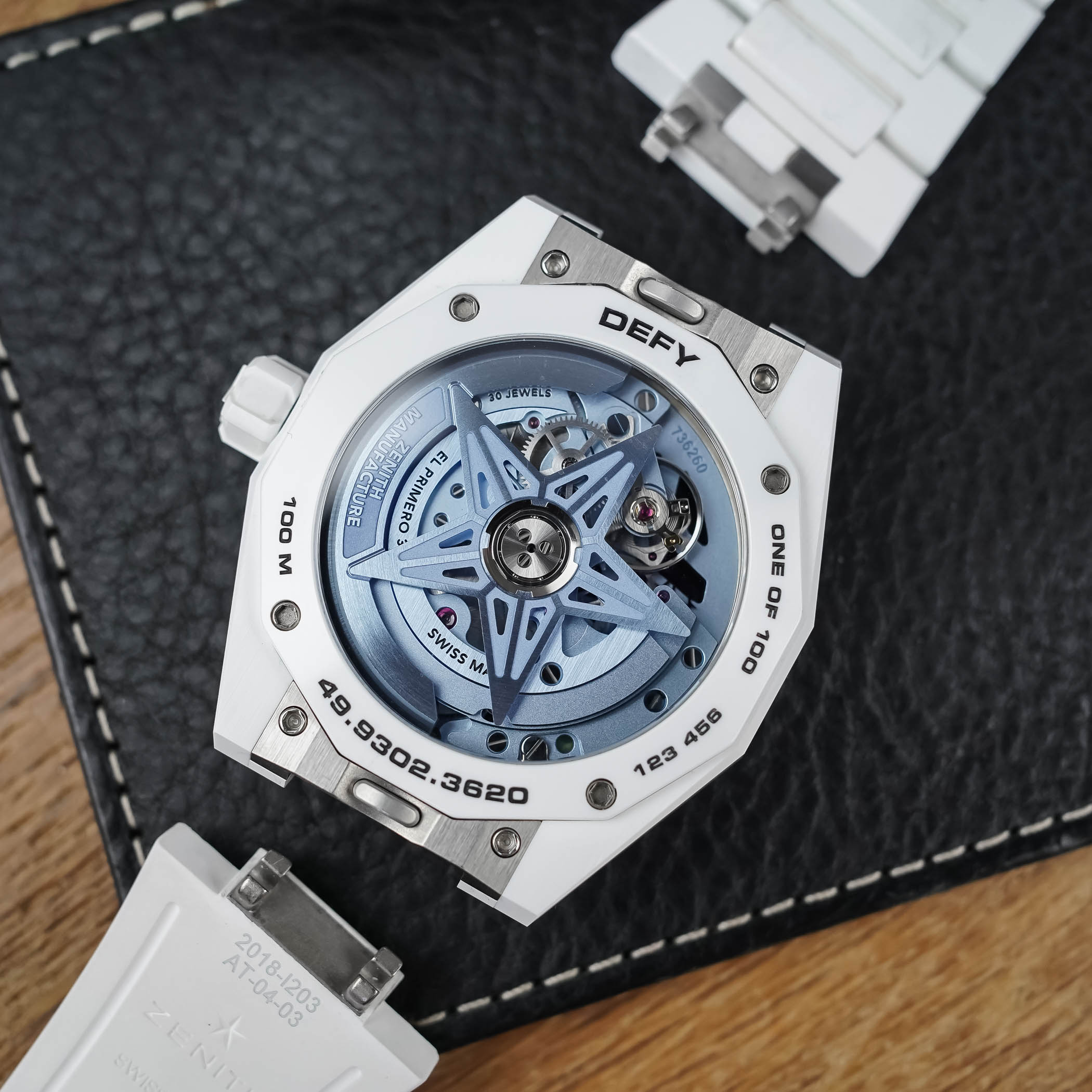 The 41mm case of the Defy Skyline Skeleton White Surfer is crafted from white ceramic, lightweight, highly scratch-resistant, inherently modern in appearance and pleasantly tactile. The case features the sharp facets and geometric contours typical of the Defy line, highlighted by brushed and polished surfaces. The screw-down crown bears the Zenith star logo, the dial is protected by a flat sapphire crystal with anti-reflective treatment, while the caseback, also with sapphire crystal, lets you view the movement. Water-resistance is 100m.