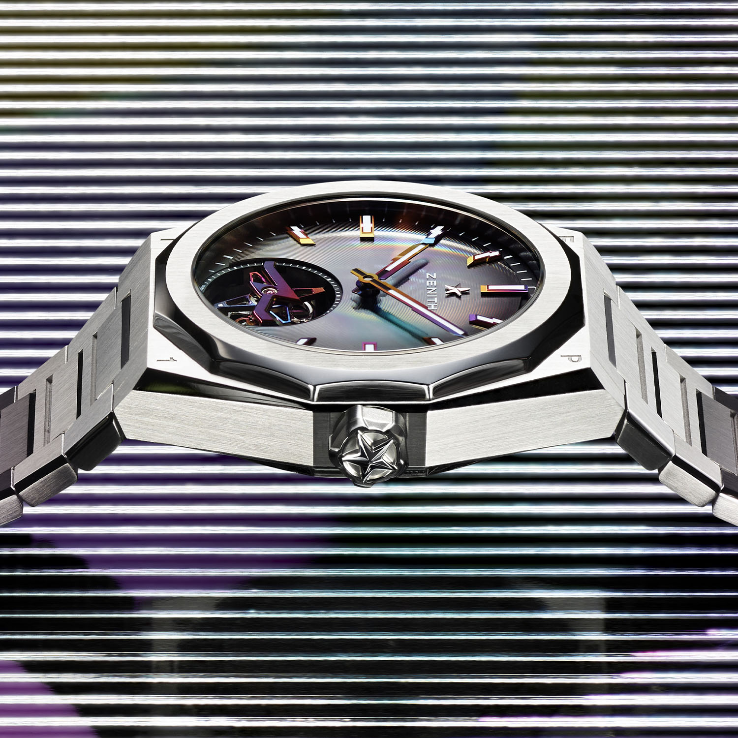 The dynamic one-minute tourbillon at 6 o’clock enhances the visual spectacle, with the tourbillon bridge also reimagined into a lightning bolt shape and finished in rainbow tones. The tourbillon regulates the El Primero 3630 high-frequency automatic movement, an in-house calibre with a 60-hour power reserve. The movement is visible through the caseback, featuring a star-shaped oscillating weight with a rainbow PVD finish and stripes arranged in a sunray pattern radiating from the tourbillon.