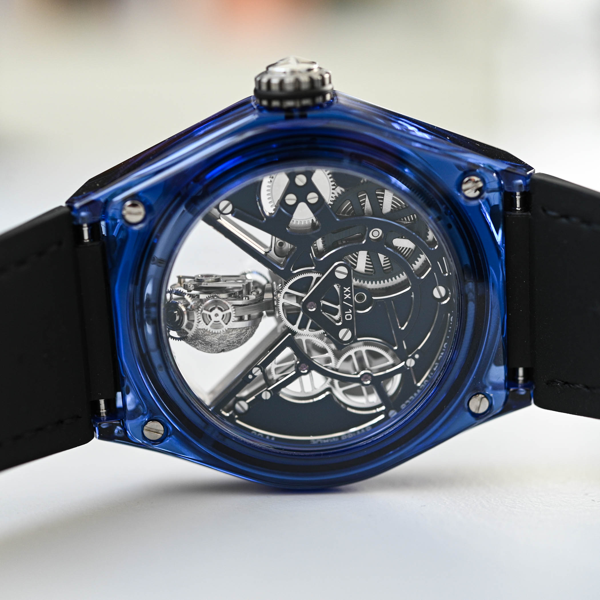 Wearability arrived with the Defy Zero G in 2018, when Zenith re-engineered the Gravity Control cage to 30% of its original volume, eliminated the dome and fit the module cleanly between flat crystals in a 44 mm titanium or pink-gold case with 100m water-resistance. In 2021, Zenith went fully transparent with a full-sapphire Defy Zero G. The movement was re-architected for greater openness and set inside a sapphire mid-case, bezel and back, letting the gyroscopic module be viewed from virtually every angle.
