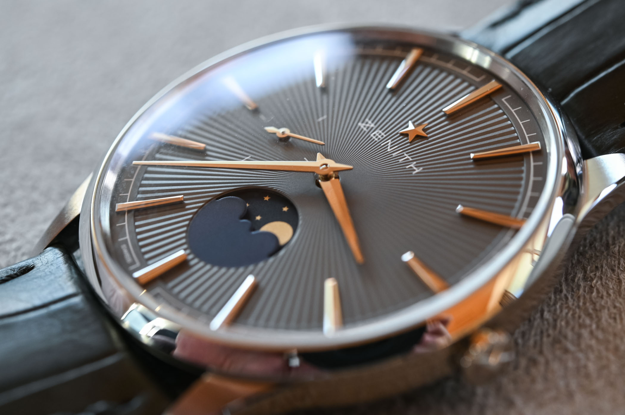 The Elite Moonphase is a handsome dress watch with enough personality to get noticed but not too much to overwhelm. The redesigned case and the sunray-patterned dials add a more contemporary look to Zenith’s classic dress watch, which is now equipped with a delightful, whimsical moon phase function. And as I mentioned above, the ultra-discreet small seconds at 9 o’clock might seem like a tiny feature but it plays a fundamental role in the watch’s identity. It’s a bit like the Dude’s (played by Jeff Bridges) lamentation in the Big Lebowski after hitmen raid his apartment and ruin his Persian rug: “it really tied the room together.”