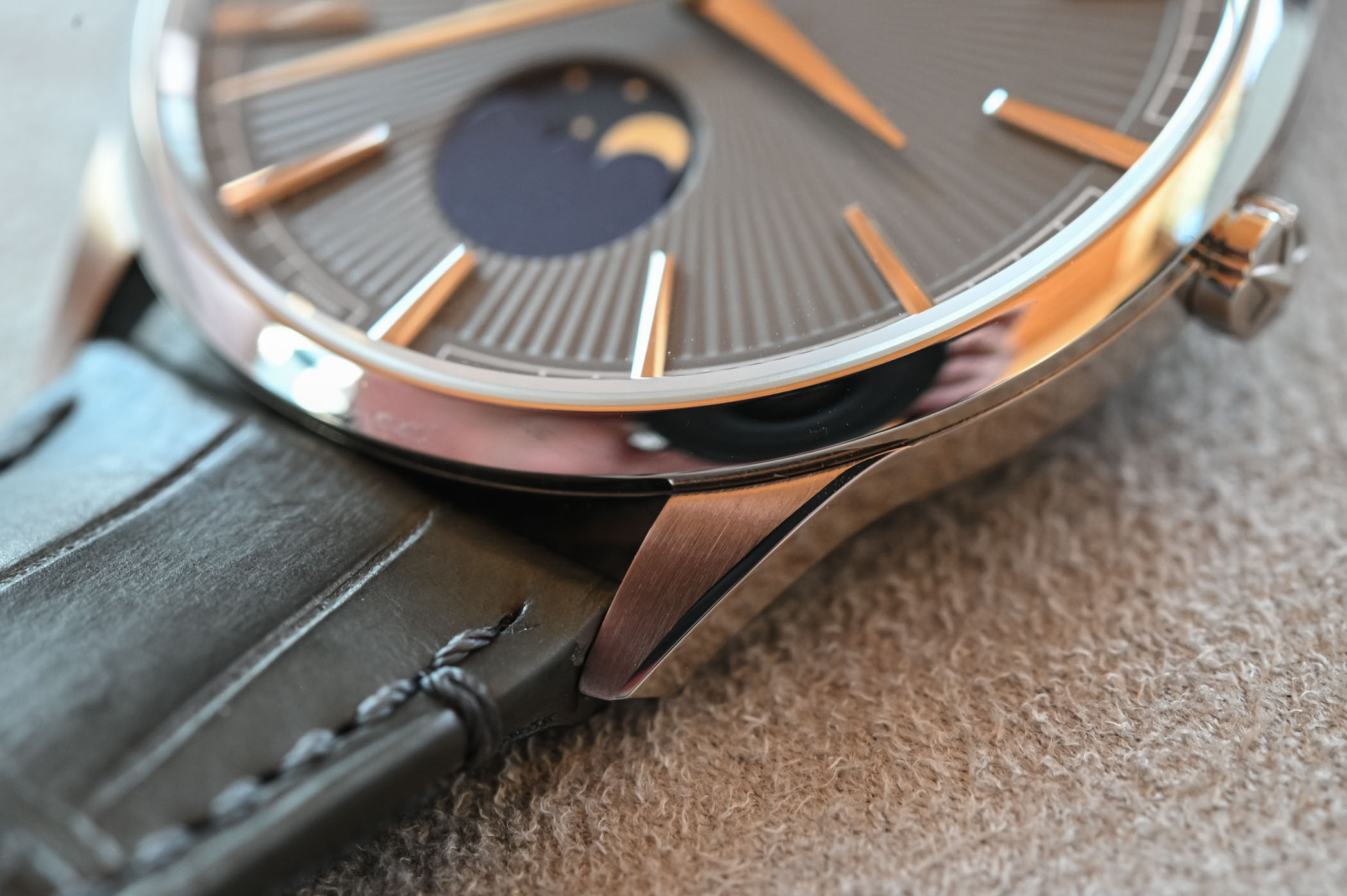 The relatively simple case with its short tapered lugs is polished but features a contrasting vertical brushed finish on the surface of the lugs attenuating their presence and concentrating the attention on the dial. The dial is where you can really appreciate the post-surgical improvements. A lovely sunray pattern, emanating from the centre of the dial, is the protagonist of the new Elite Moonphase family. The pattern is stamped on the surface of the silver-toned and slate-grey background colour of the dials adding a sharper, more dynamic touch. The pleated effect of the pattern also adds depth and plays with light and shadows, something our friends at Grand Seiko have mastered to perfection.