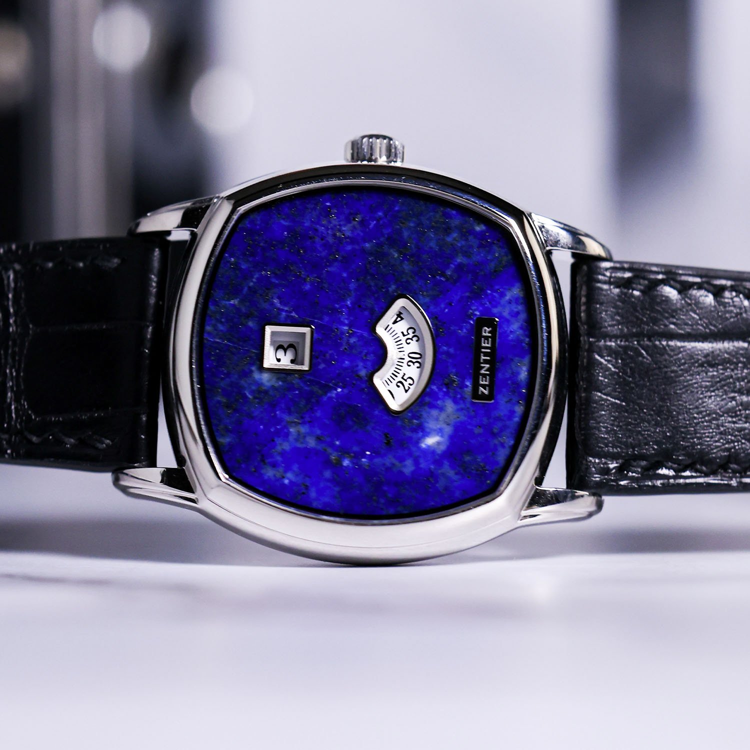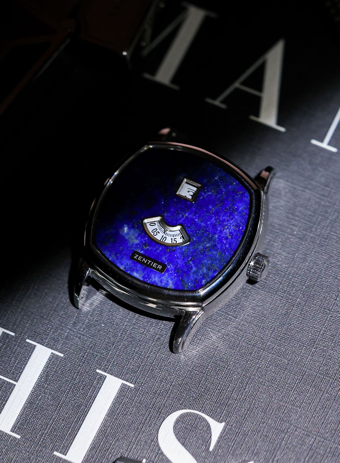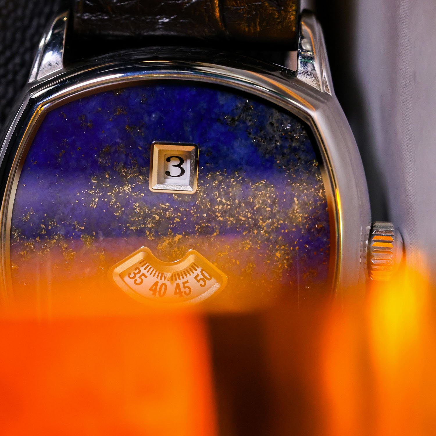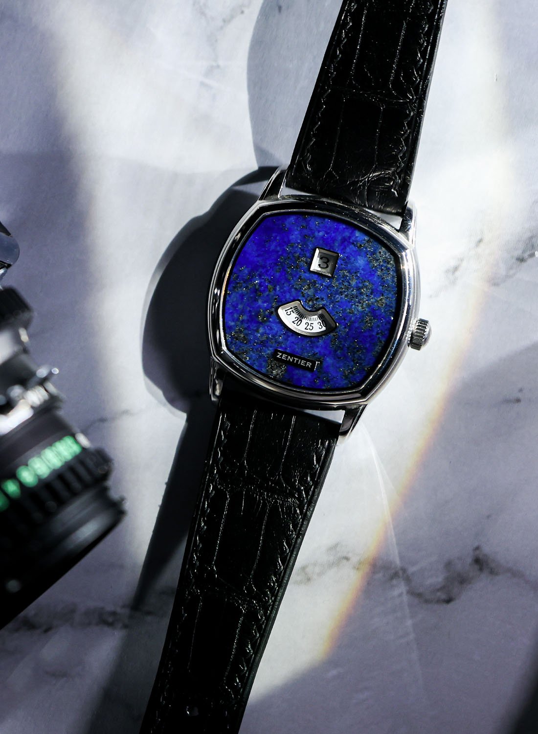 Playing on the renewed trend for hard stone dials, Watch Ho & Co. unveiled last year a collaboration with Zentier that was pretty striking, not only in its look but also its display. The Zentier Sauté is indeed an accessible take on the jumping hour complication, executed in the traditional “guichets” fashion – just like the emblematic Tank à Guichets from Cartier, with jumping hour at 12 o’clock and dragging minutes in an arched window at 6 o’clock. The first edition featured an attractive green malachite dial and this second collaboration with the young watch brand Zentier opts for another popular hard stone, blue lapis lazuli.
